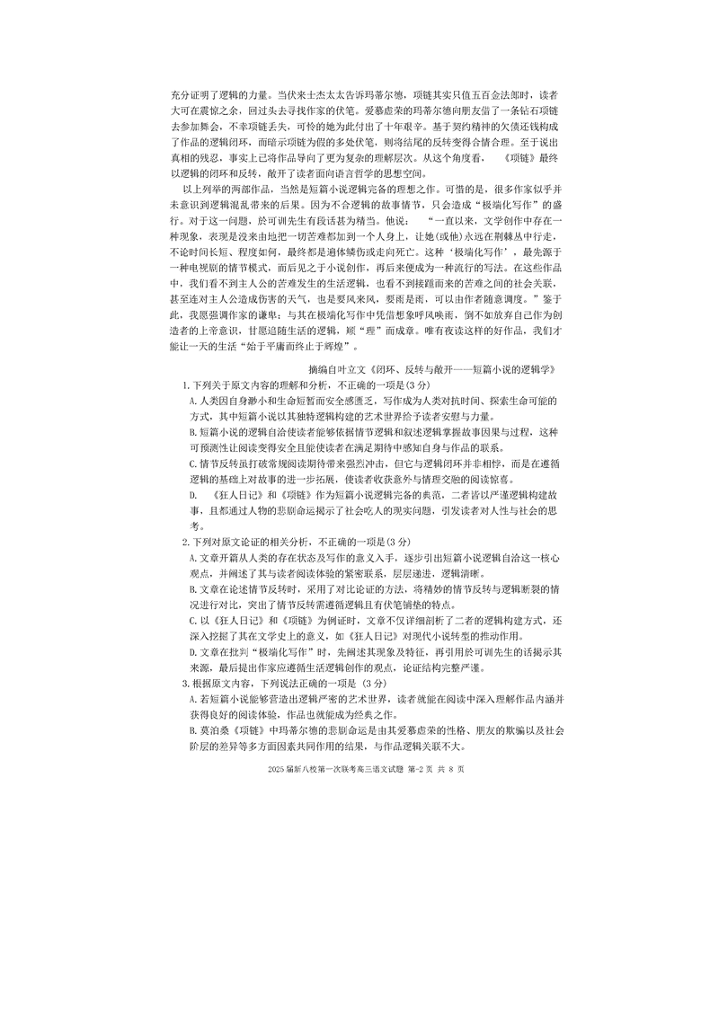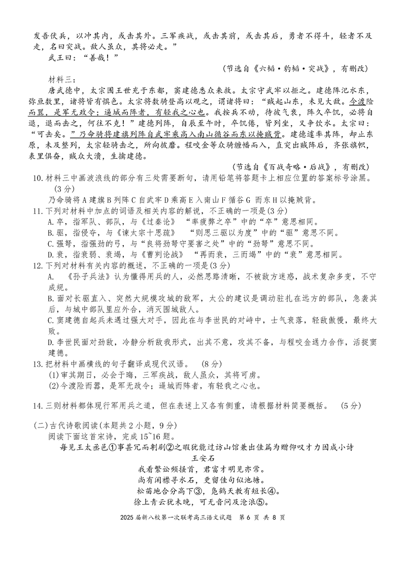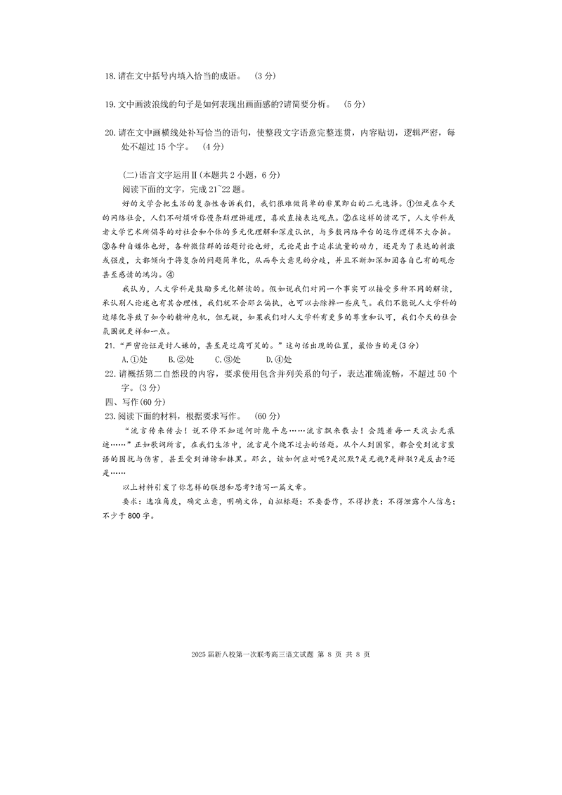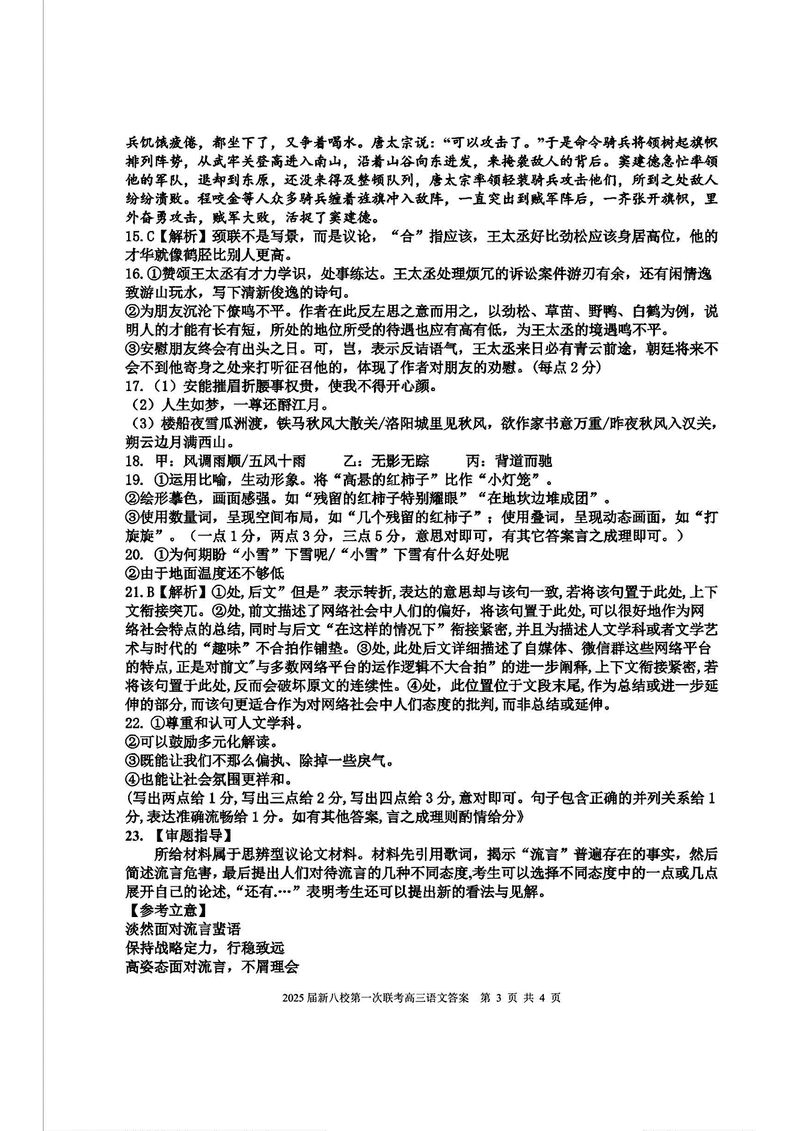 江西省新八校2025届高三第一次联考语文试题及答案 时间:2025-01-27 江西 语文试题 江西省新八校2025届高三第一次联考语文考试已于近日开考,为方便考生考后及时查看考试情况,查漏补缺、弥补不足,本文整理了试题答案解析相关信息! 汇总:江西省新八校2025届高三第一次联考试题及答案汇总 语文试题及答案解析