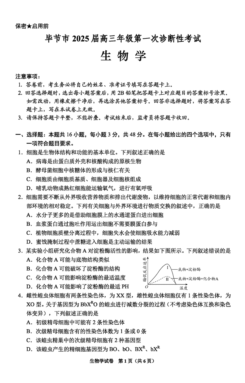 毕节一诊2025届高三上学期第一次诊断生物试题及答案