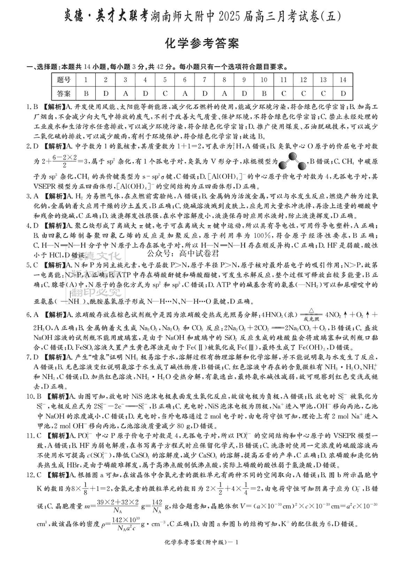 湖南师大附中2025届高三上学期月考(五)化学考试已于近日开考,为方便考生考后及时查看考试情况,查漏补缺、弥补不足,本文整理了试题答案解析相关信息!