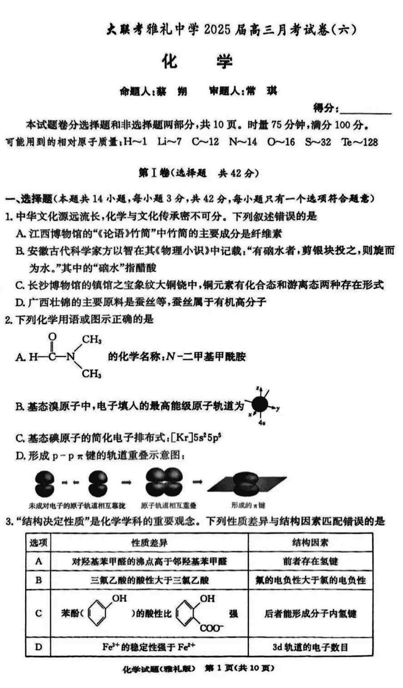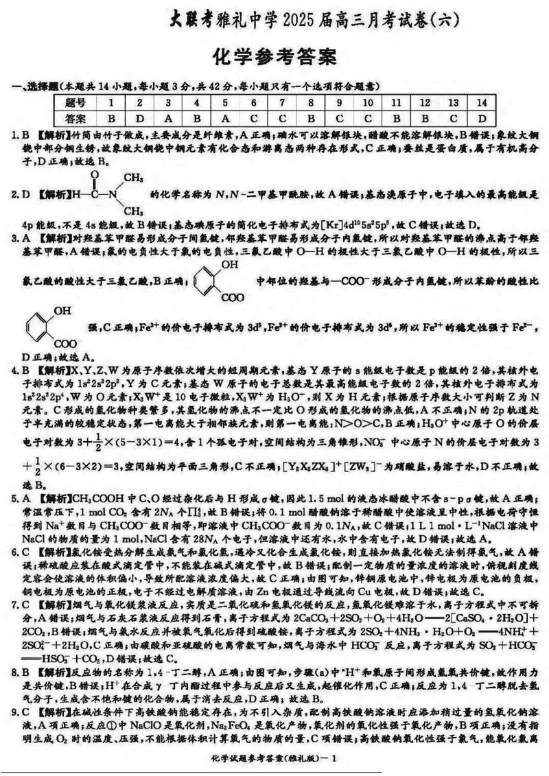 湖南雅礼中学2025届高三月考试卷(六)化学考试已于近日开考,为方便考生考后及时查看考试情况,查漏补缺、弥补不足,本文整理了试题答案解析相关信息!