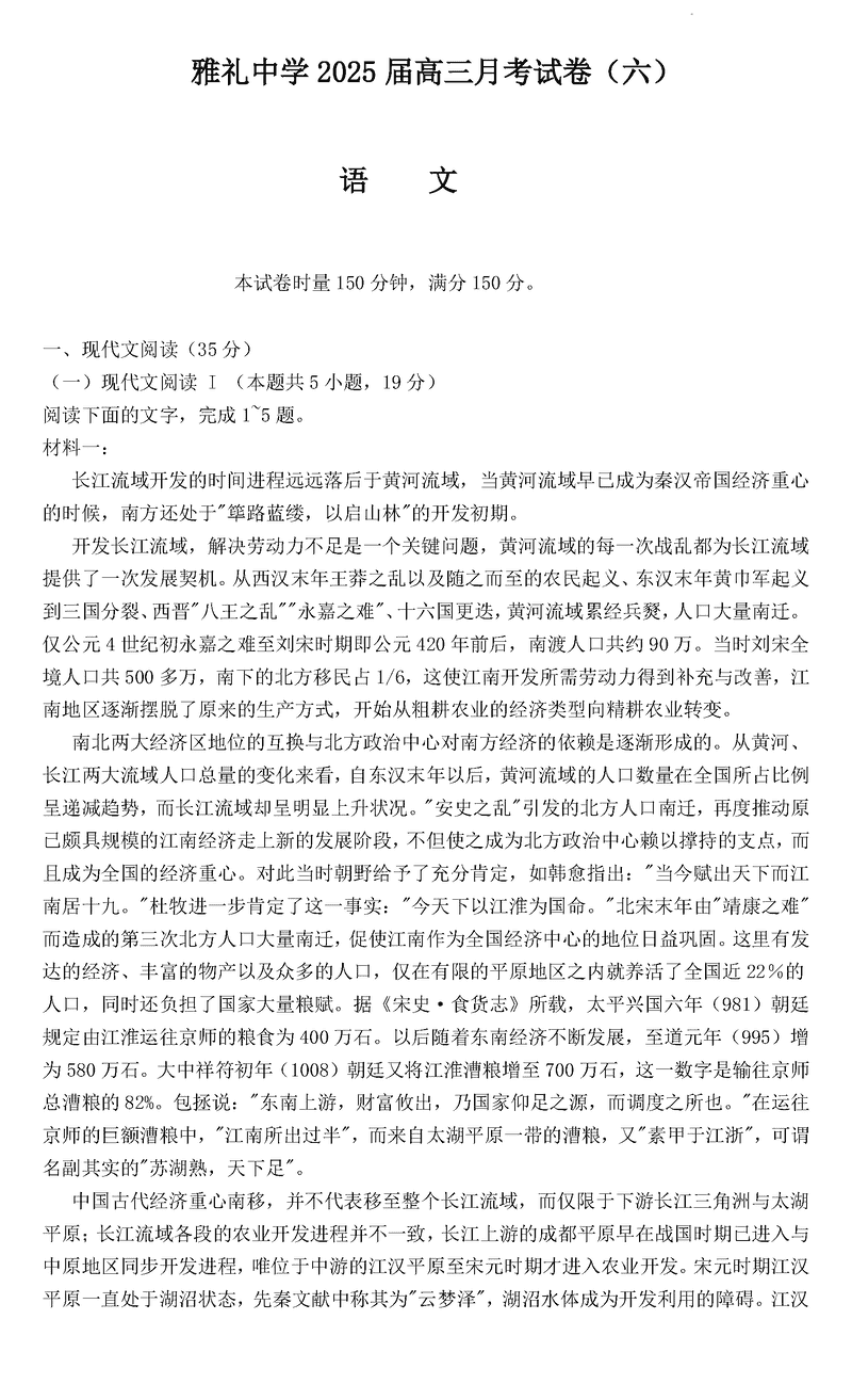 湖南雅礼中学2025届高三月考试卷(六)语文试题及答案