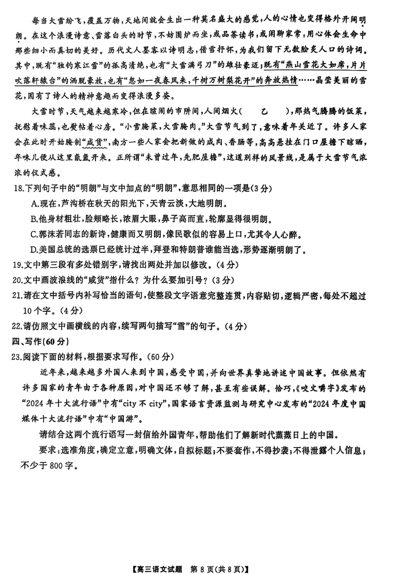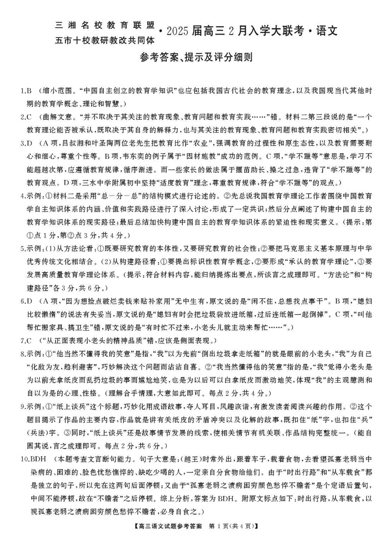2025届三湘名校教育联盟五市十校教研教改共同体高三下2月入学大联考语文试题及答案