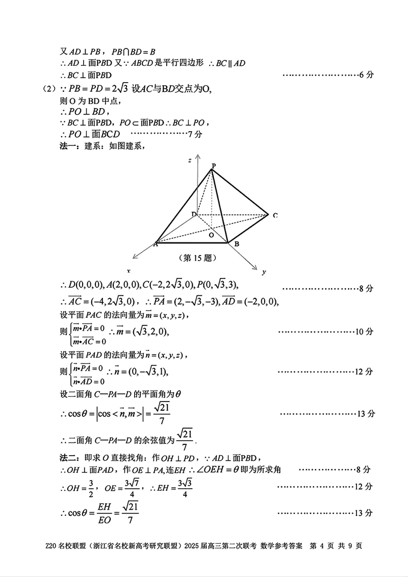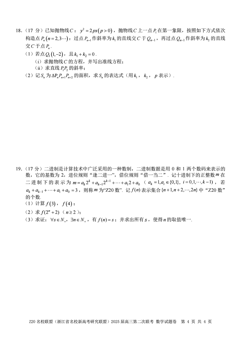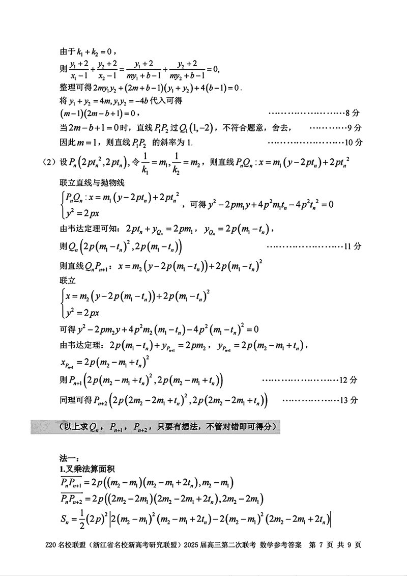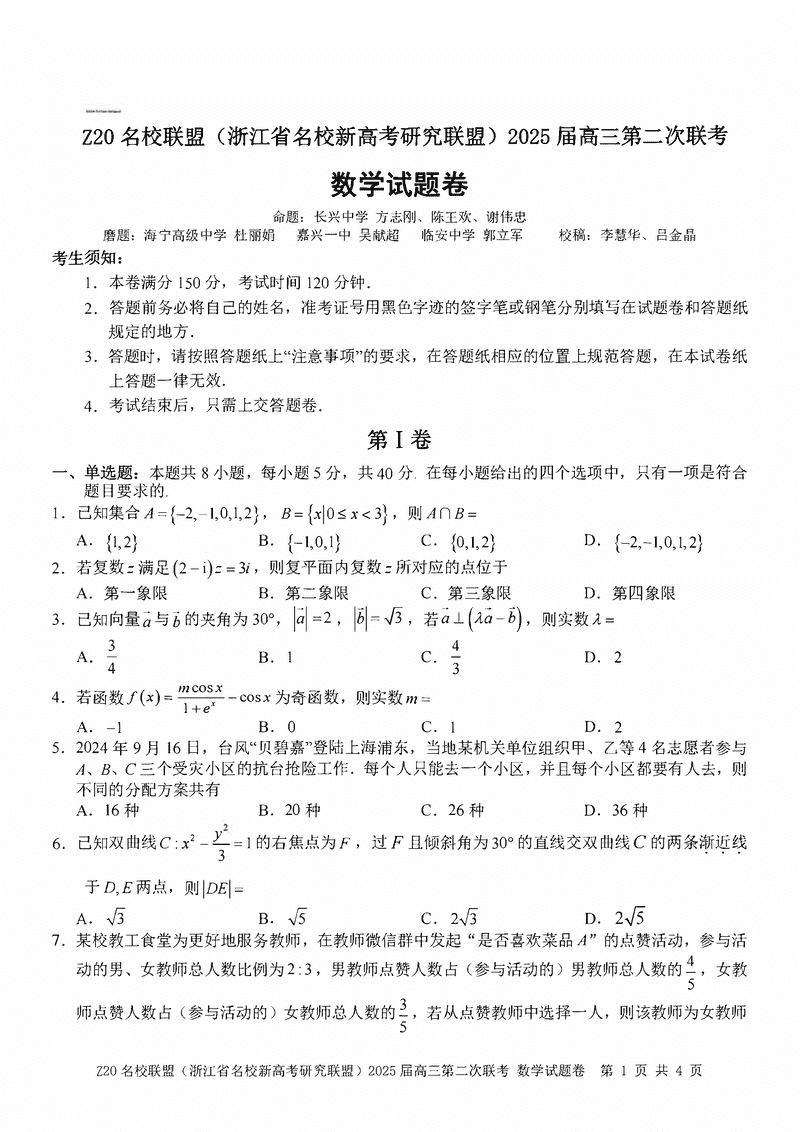 浙江Z20名校联盟2025届高三第二次联考数学试题及答案