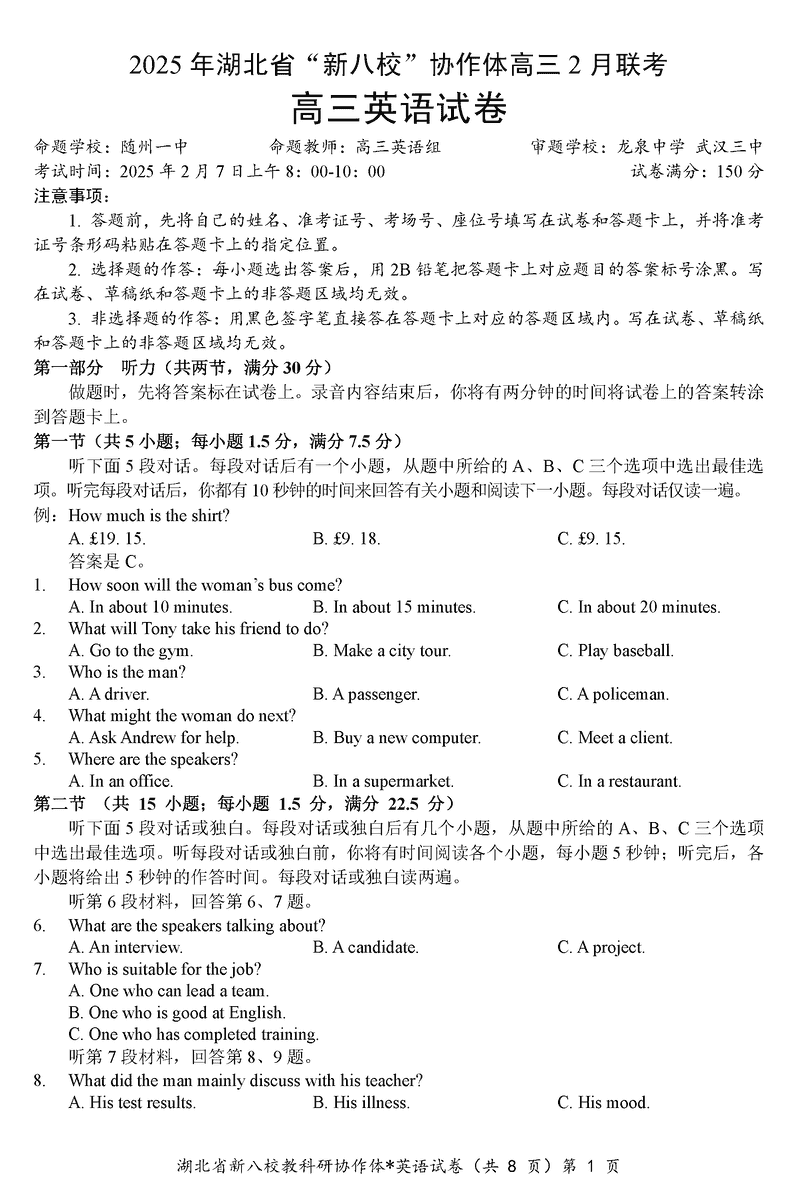 2025年湖北省新八校协作体高三2月联考英语试题及答案