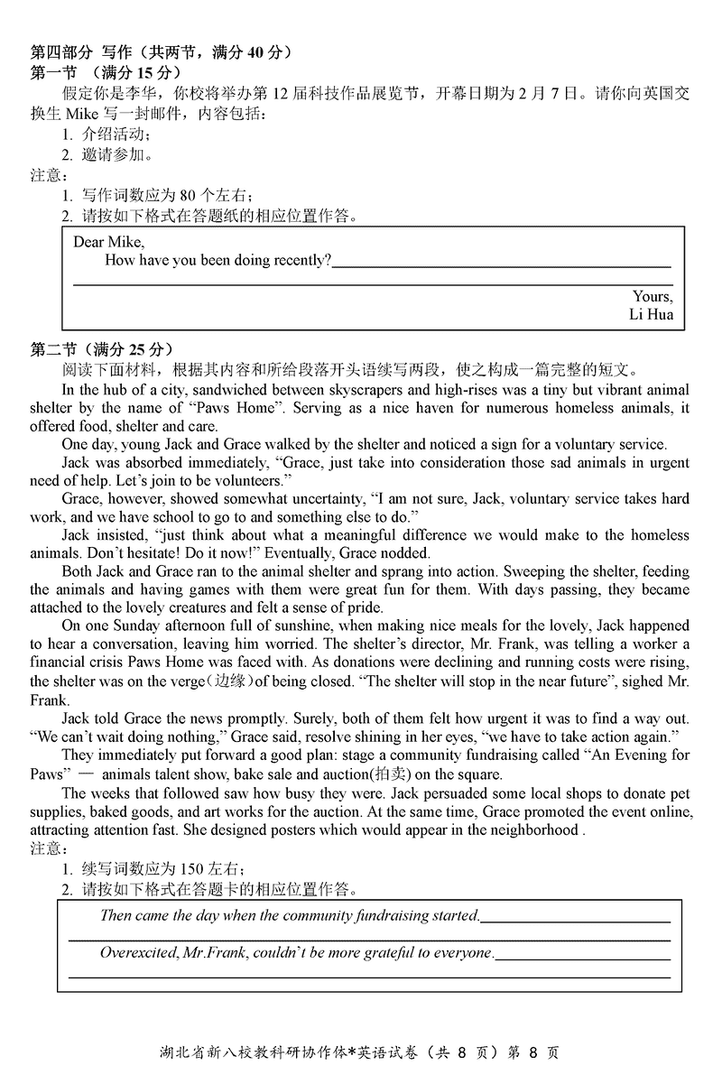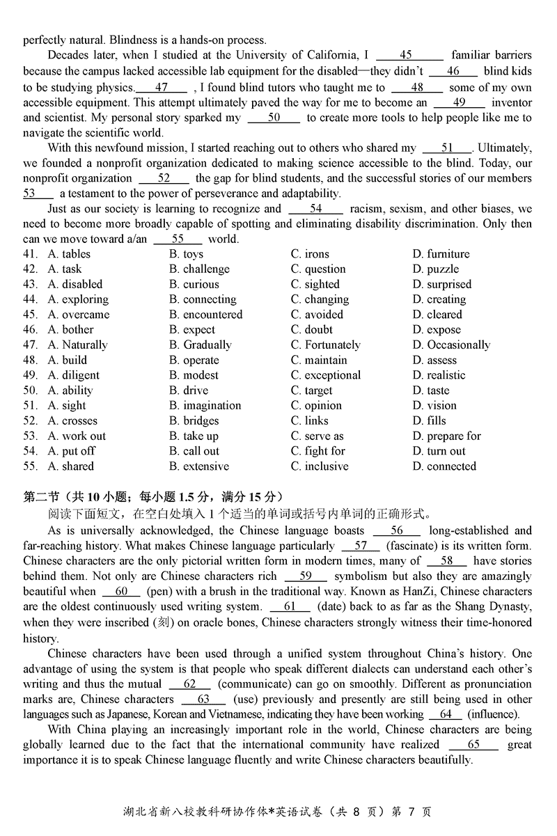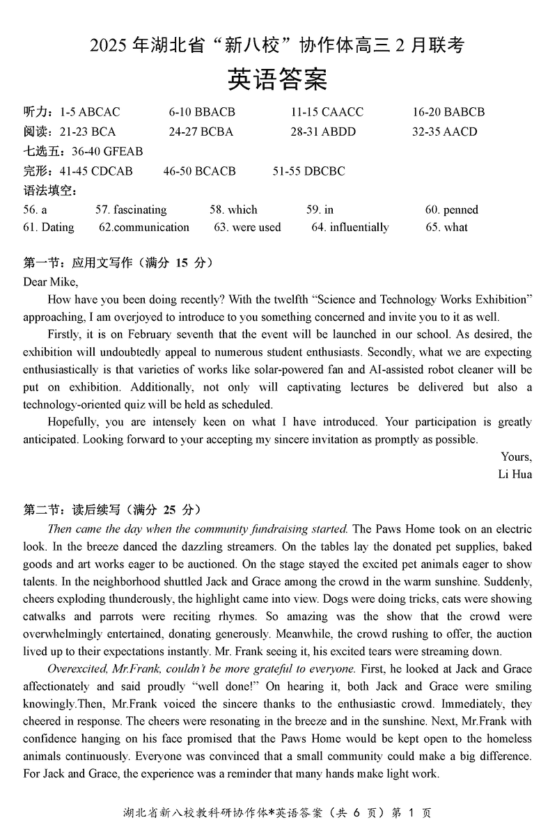 2025年湖北省新八校协作体高三2月联考英语考试已于近日开考,为方便考生考后及时查看考试情况,查漏补缺、弥补不足,本文整理了试题答案解析相关信息!