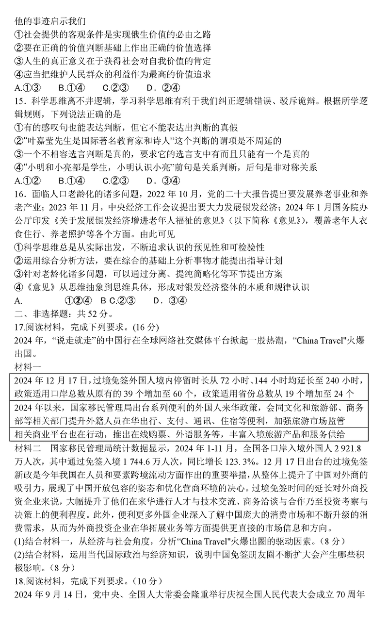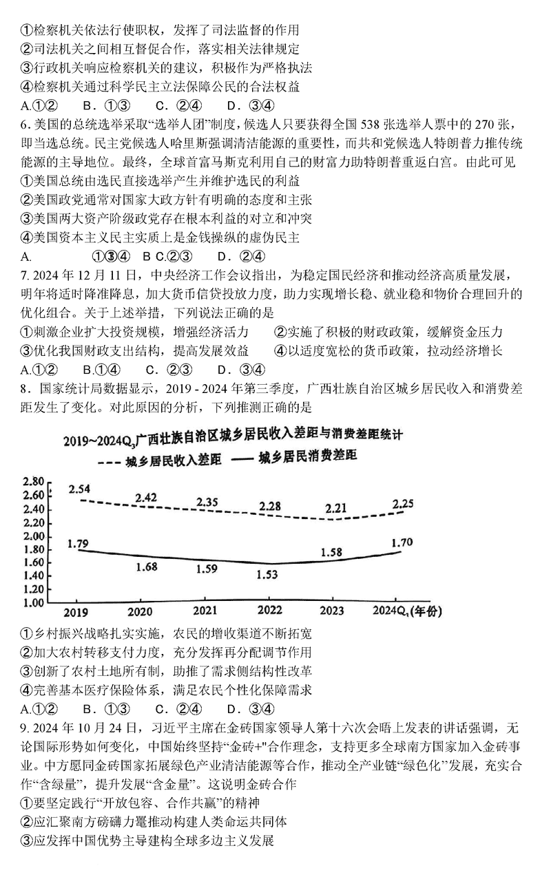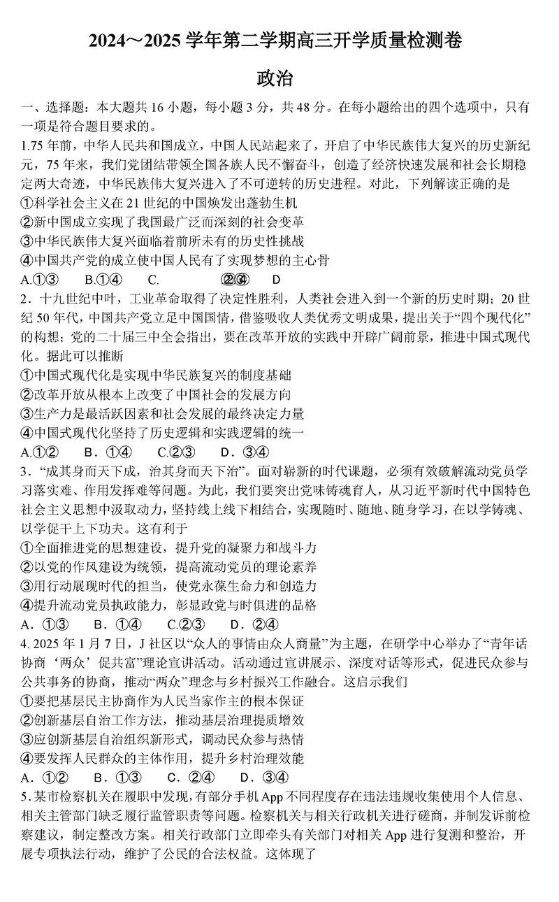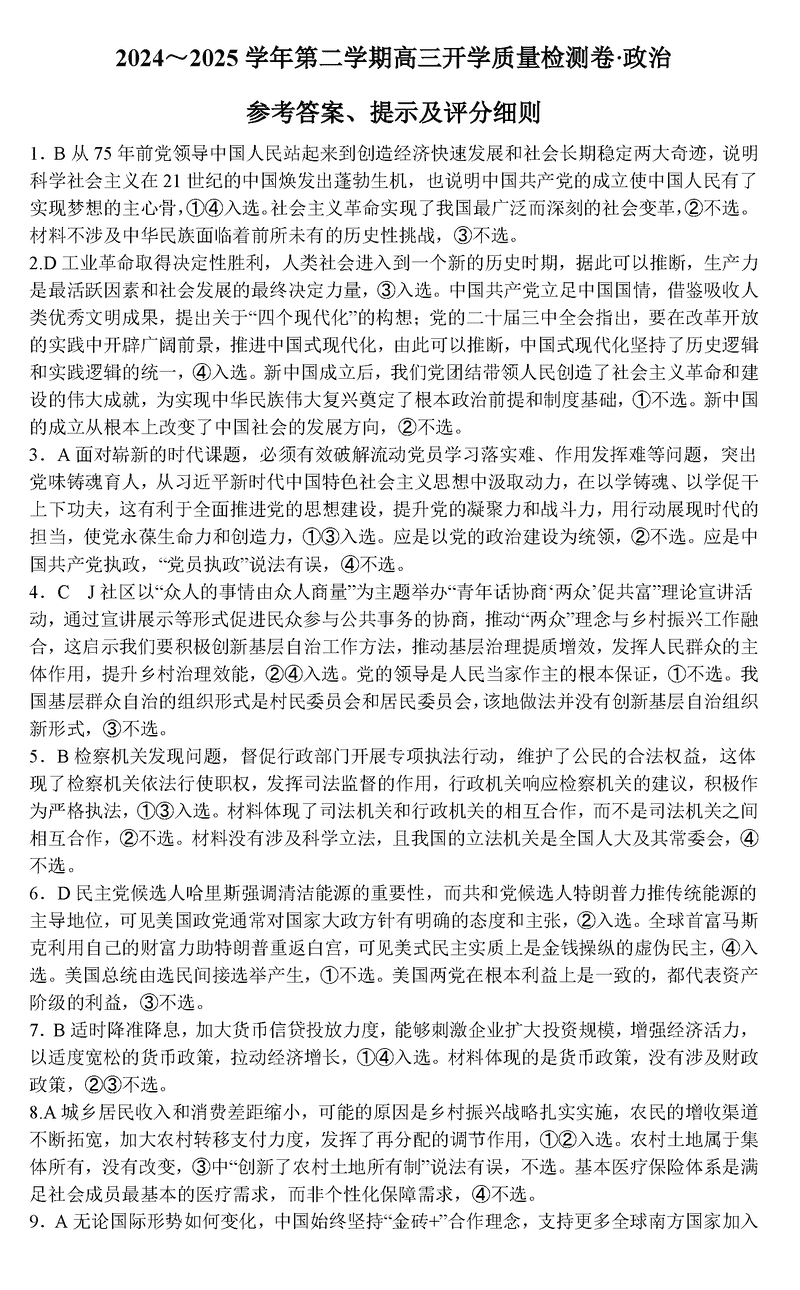 山西卓越联盟2025届高三下学期2月开学政治试题及答案