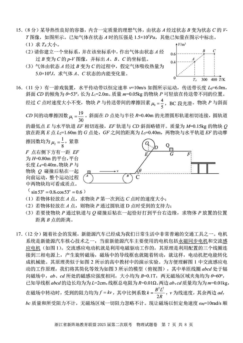 浙江新阵地教育联盟2025届高三第二次联考物理试题及答案
