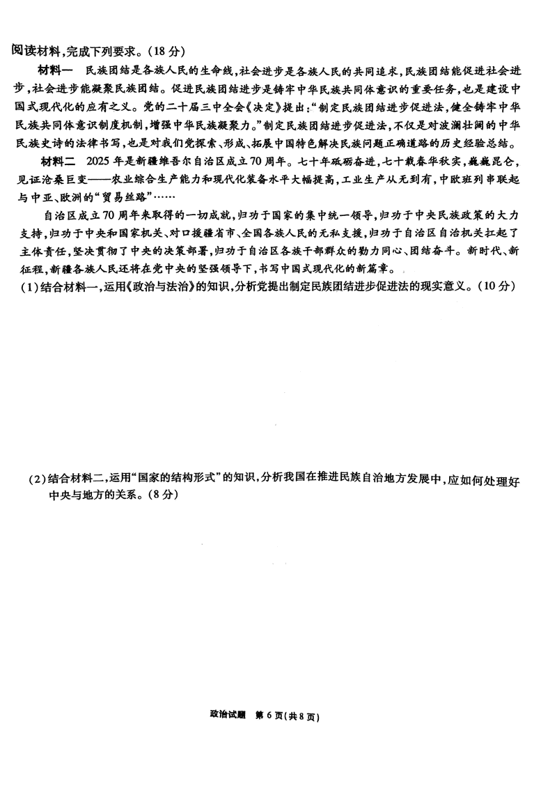 安徽六校2025年高三2月春季素质检测政治试题及答案