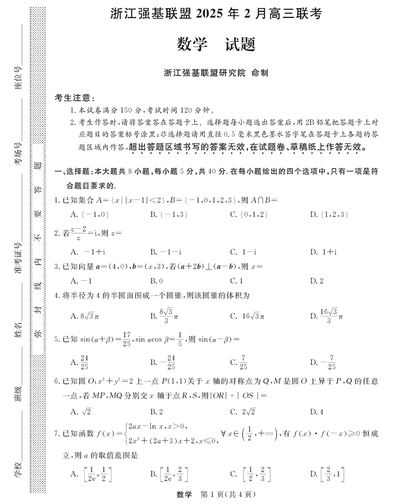 浙江强基联盟2025年2月高三下学期联考数学试题及答案