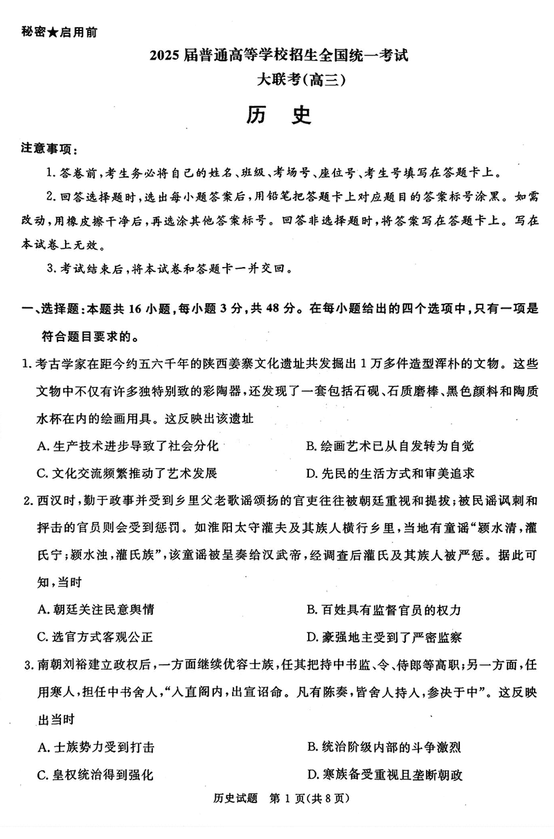 2025届河南青桐鸣高三2月联考历史试题及答案 时间:2025-02-19 河南 文综试题 2025届河南青桐鸣高三2月联考历史考试已于近日开考,为方便考生考后及时查看考试情况,查漏补缺、弥补不足,本文整理了试题答案解析相关信息! 汇总:2025届河南青桐鸣高三2月联考试题及答案汇总 历史试题及答案解析