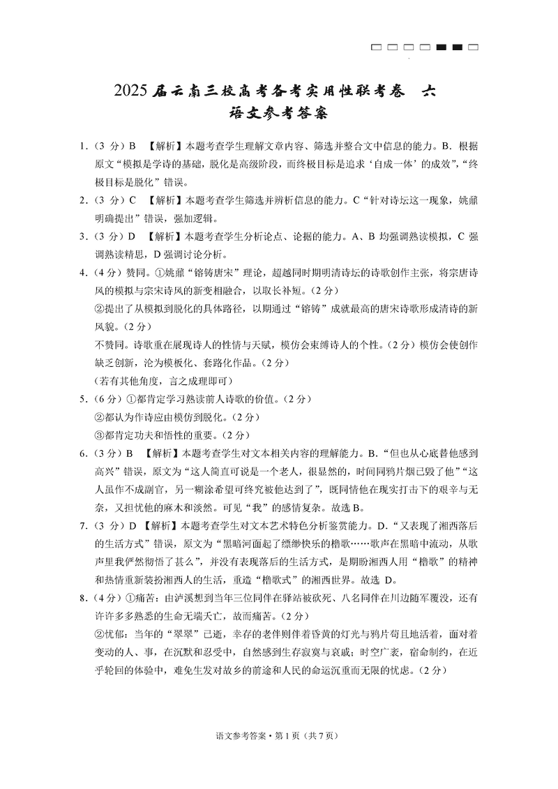 云南省三校2025届高三下高考备考实用性联考卷(六)语文考试已于近日开考,为方便考生考后及时查看考试情况,查漏补缺、弥补不足,本文整理了试题答案解析相关信息!