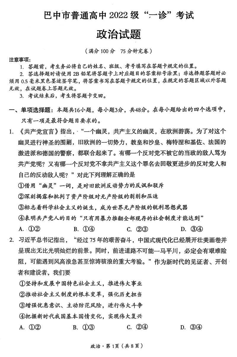巴中一诊2025年高三第一次诊断性考政治试题及答案 时间:2025-02-22 四川 文综试题 巴中一诊2025年高三第一次诊断性考政治考试已于近日开考,为方便考生考后及时查看考试情况,查漏补缺、弥补不足,本文整理了试题答案解析相关信息! 汇总:巴中一诊2025年高三第一次诊断性考试题及答案汇总 政治试题及答案解析