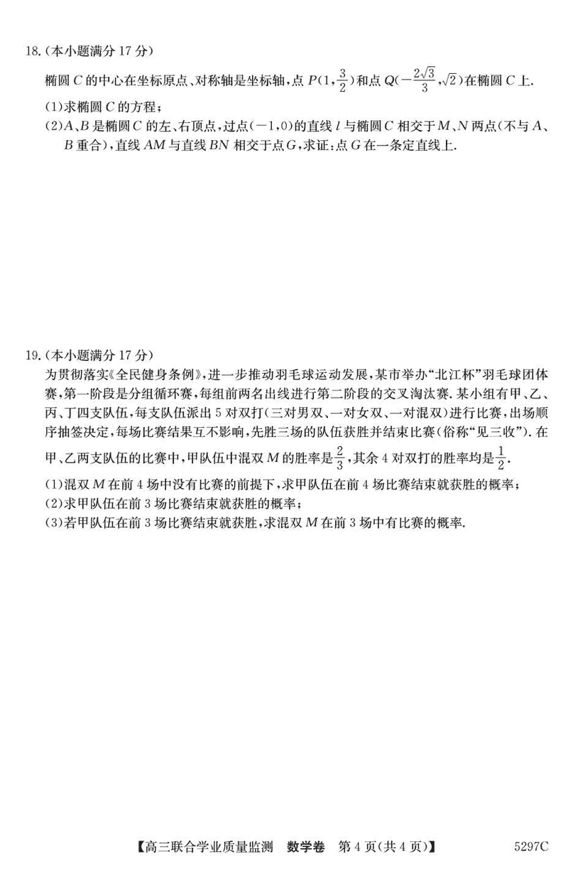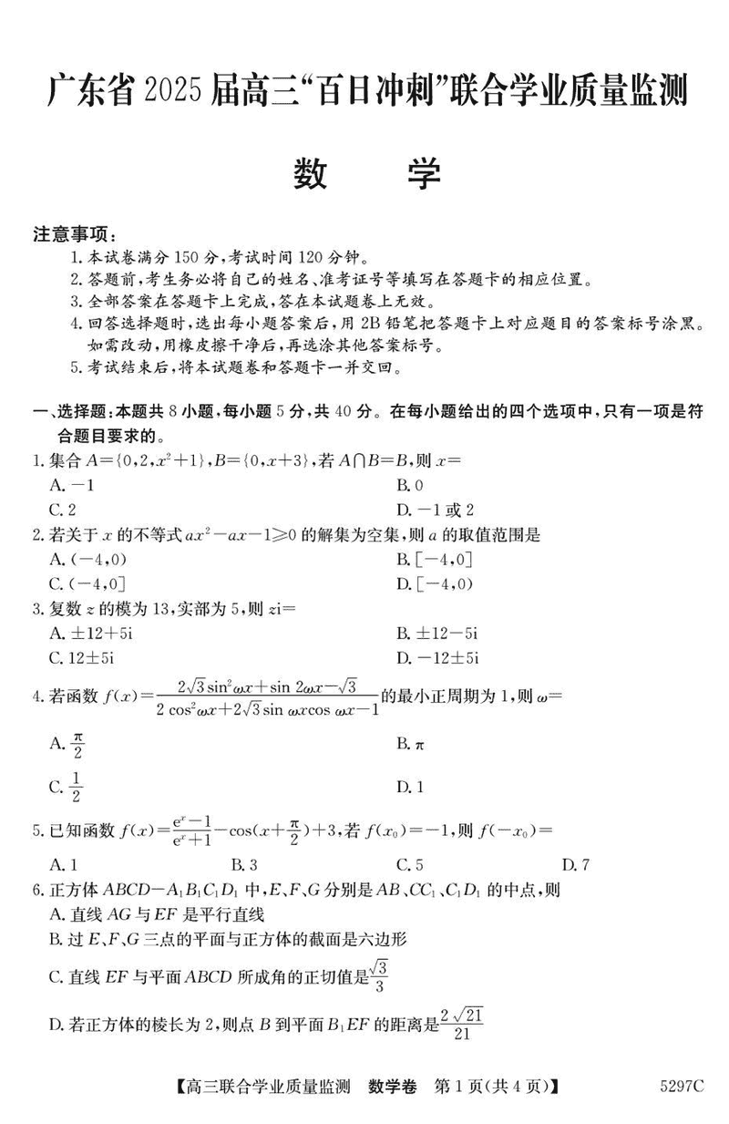 广东省2025届高三"百日冲刺"联合学业质量监测数学试题及答案