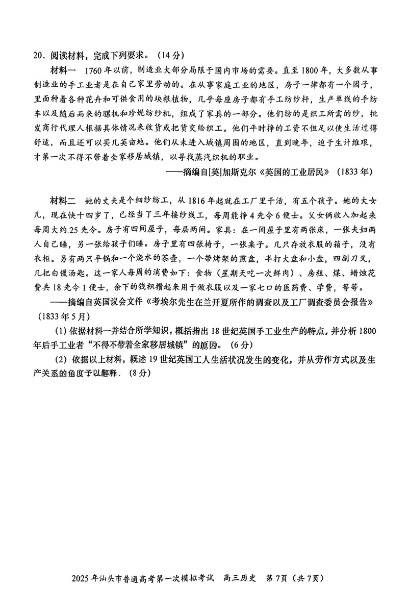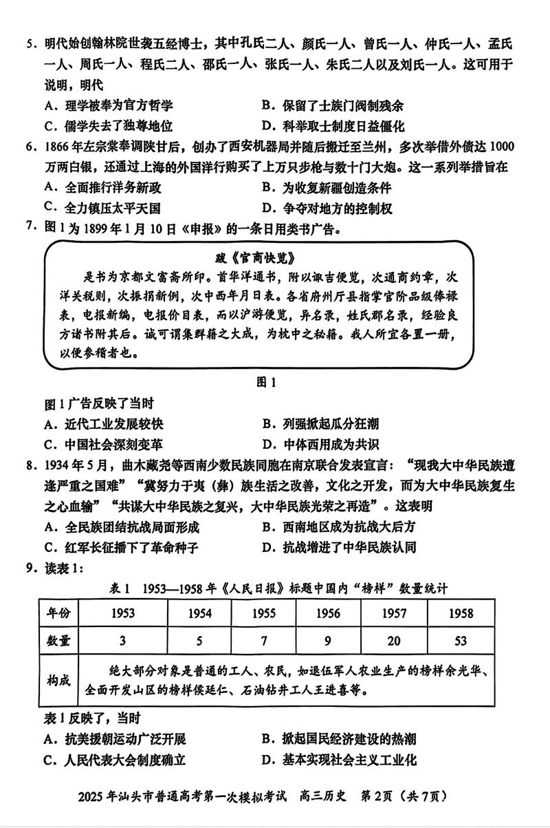 汕头一模2025届高三下学期第一次模拟考历史试题及答案