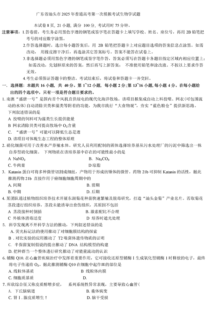 汕头一模2025届高三下学期第一次模拟考生物考试已于近日开考,为方便考生考后及时查看考试情况,查漏补缺、弥补不足,本文整理了试题答案解析相关信息!