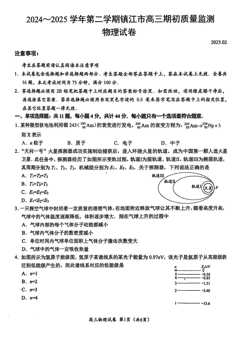 江苏镇江2024-2025学年高三下学期期初质量监测物理试题及答案
