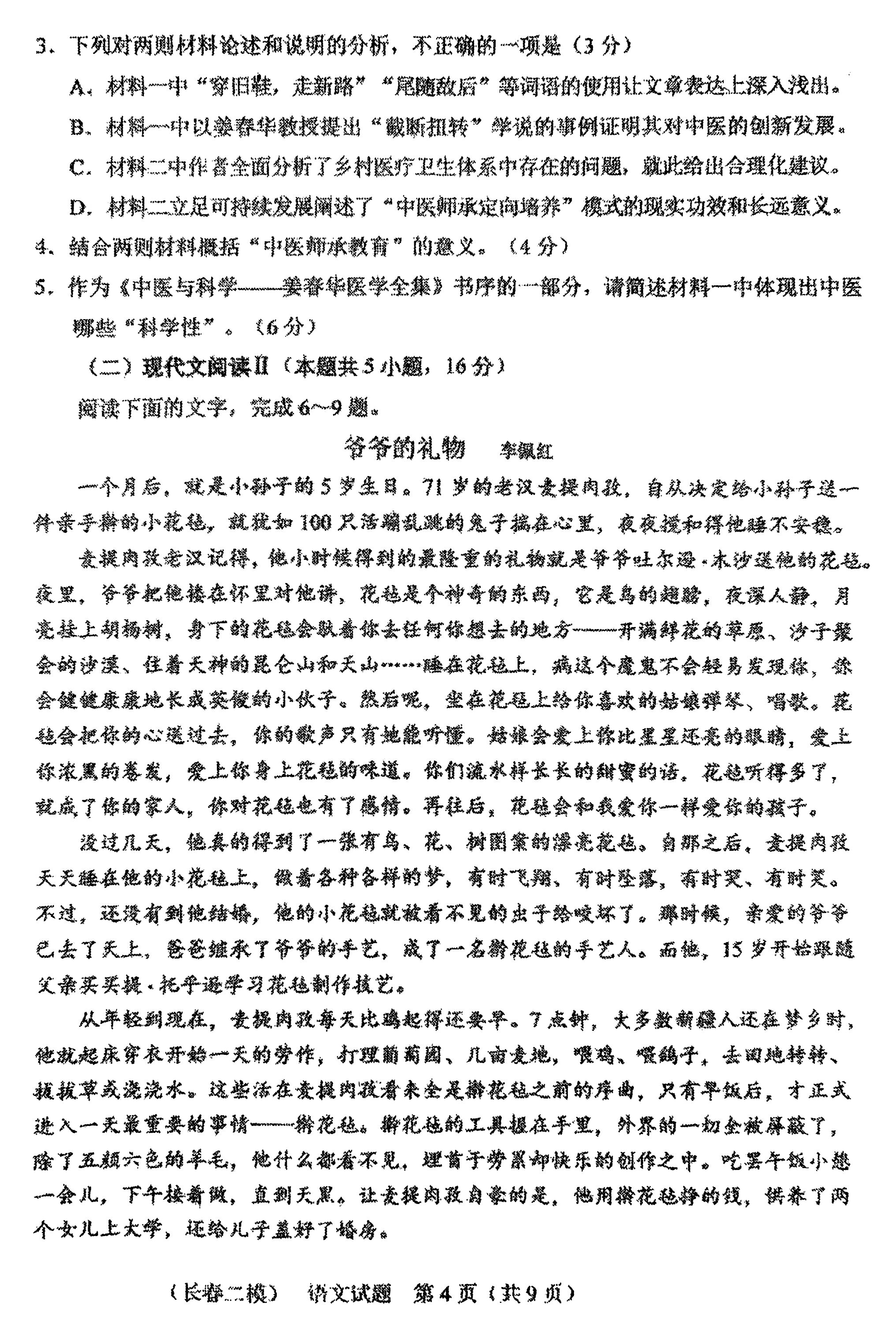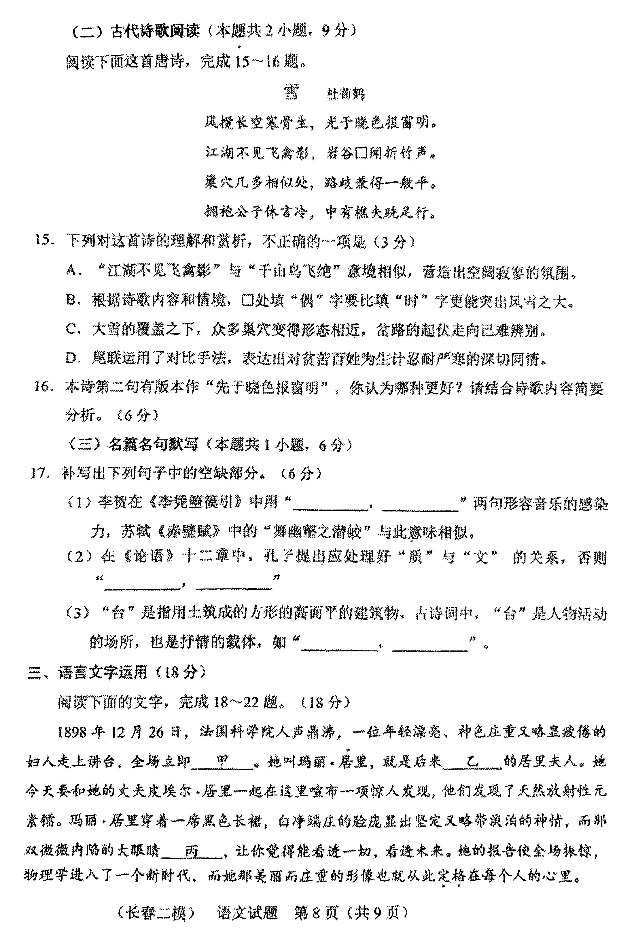 长春二模2025届高三质量监测(二)语文试题及答案 时间:2025-02-26 吉林 语文试题 长春二模2025届高三质量监测(二)语文考试已于近日开考,为方便考生考后及时查看考试情况,查漏补缺、弥补不足,本文整理了试题答案解析相关信息! 汇总:长春二模2025届高三质量监测(二)试题及答案汇总 语文试题及答案解析