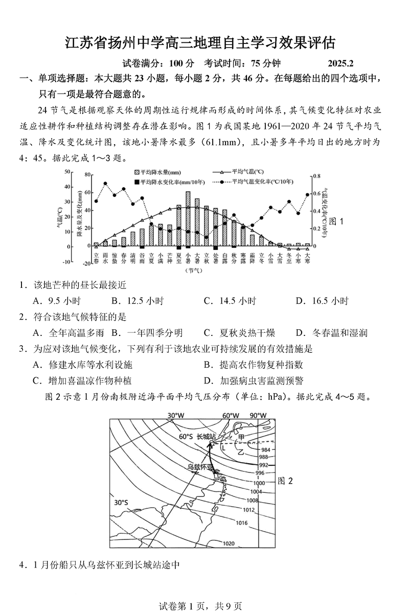 扬州中学2024-2025学年高三下学期2月阶段月考地理试题及答案