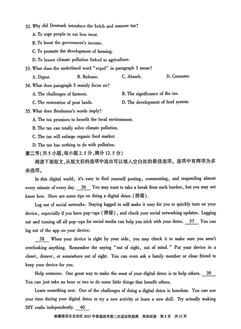 新疆2025年普通高考第二次适应性检测英语试题及答案 时间:2025-03-09 新疆 英语试题 新疆2025年普通高考第二次适应性检测英语考试已于近日开考,为方便考生考后及时查看考试情况,查漏补缺、弥补不足,本文整理了试题答案解析相关信息! 汇总:新疆2025年普通高考第二次适应性检测试题及答案汇总 英语试题及答案解析