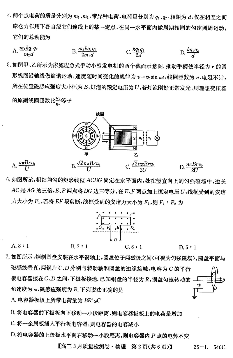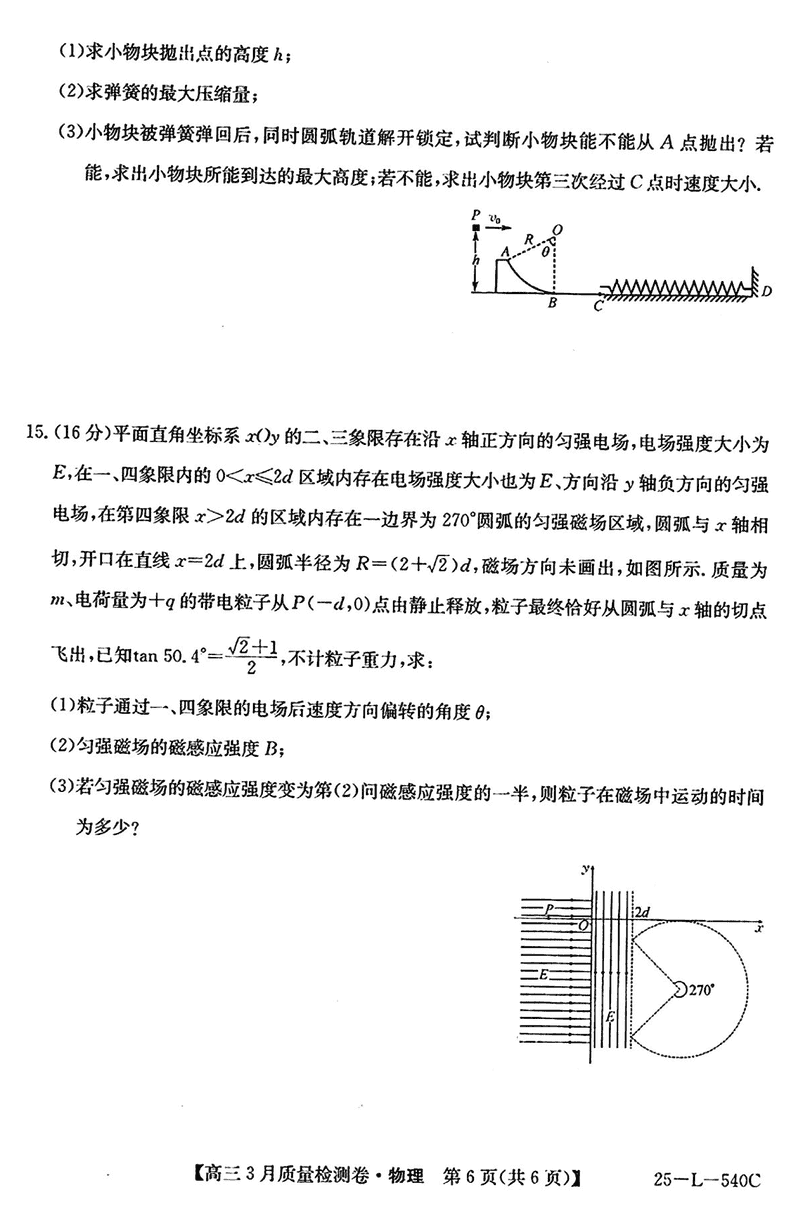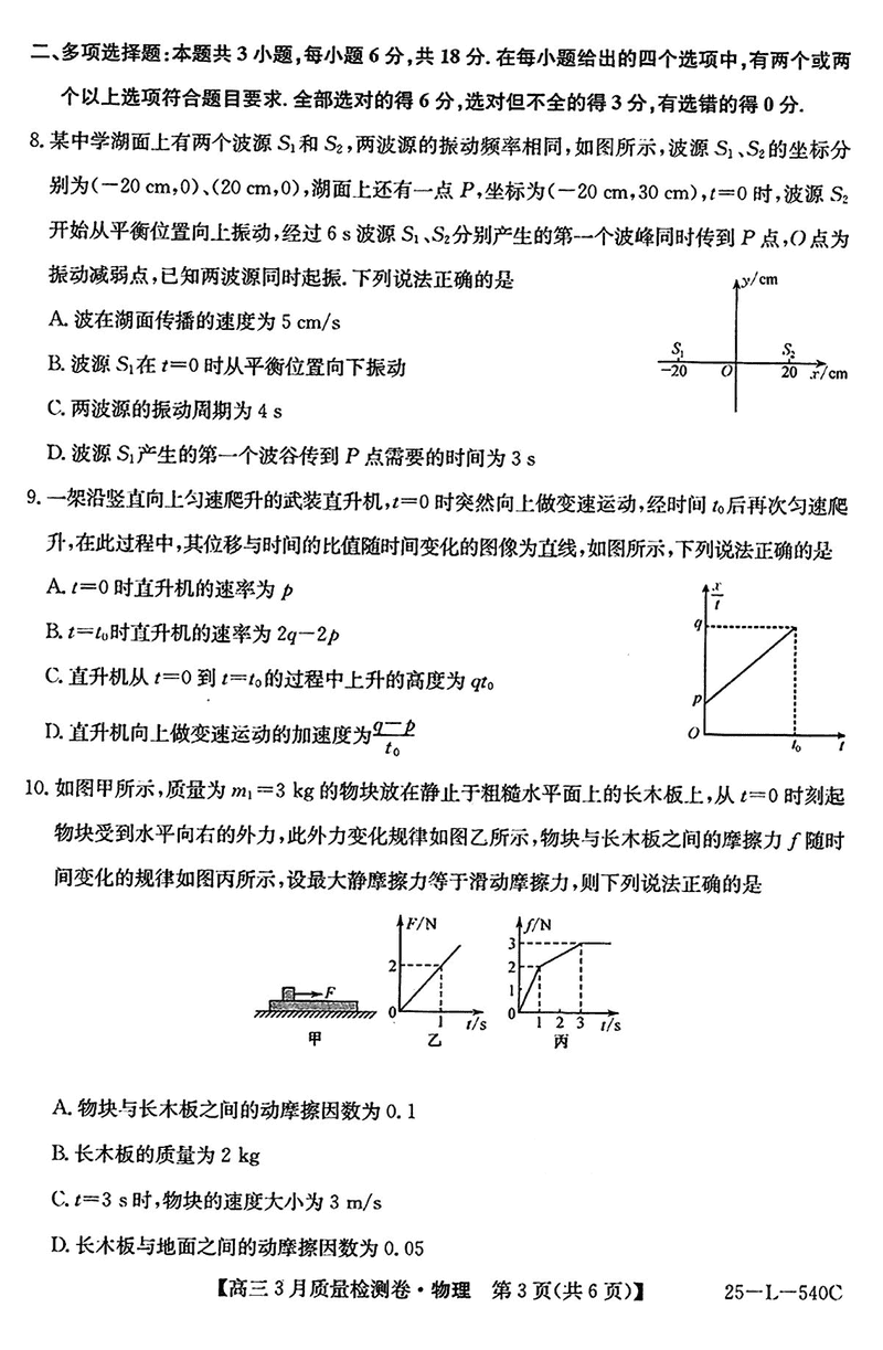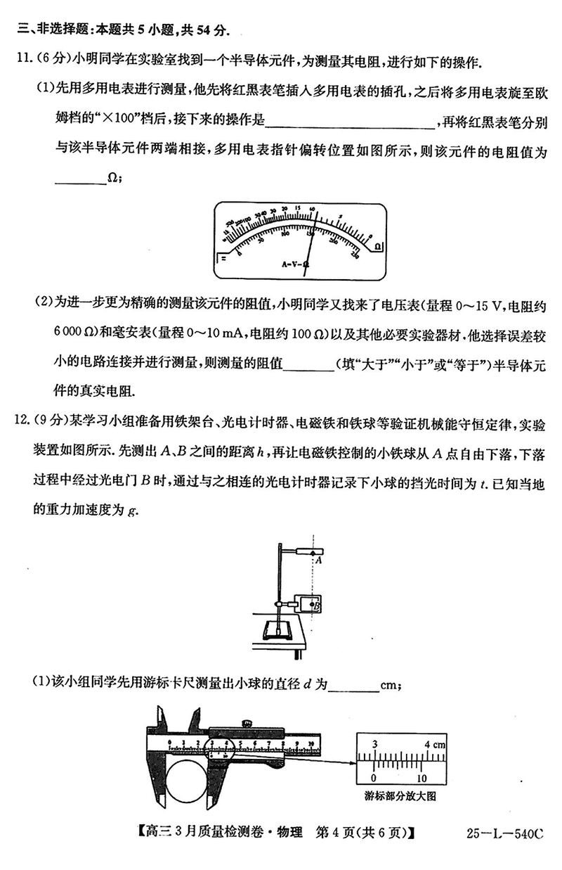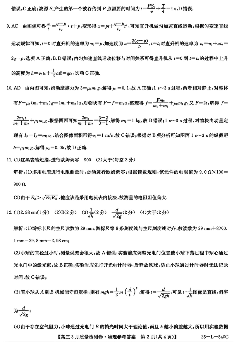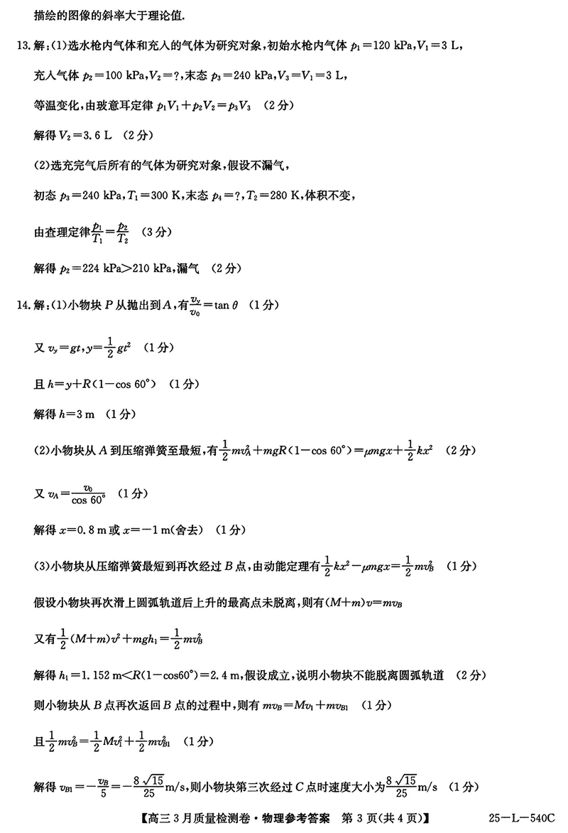 山西省三晋卓越联盟2025届高三3月质检物理试题及答案