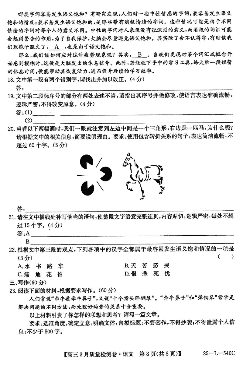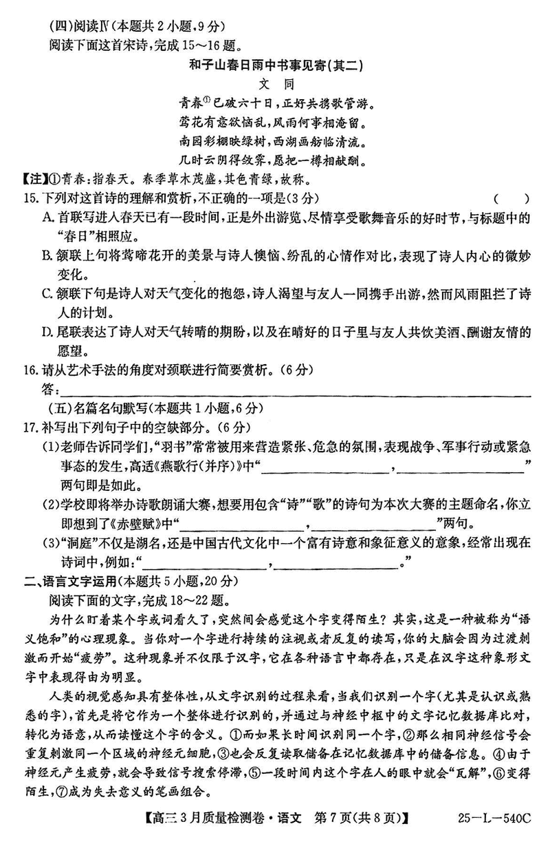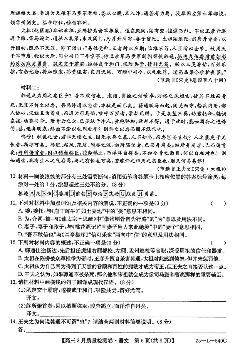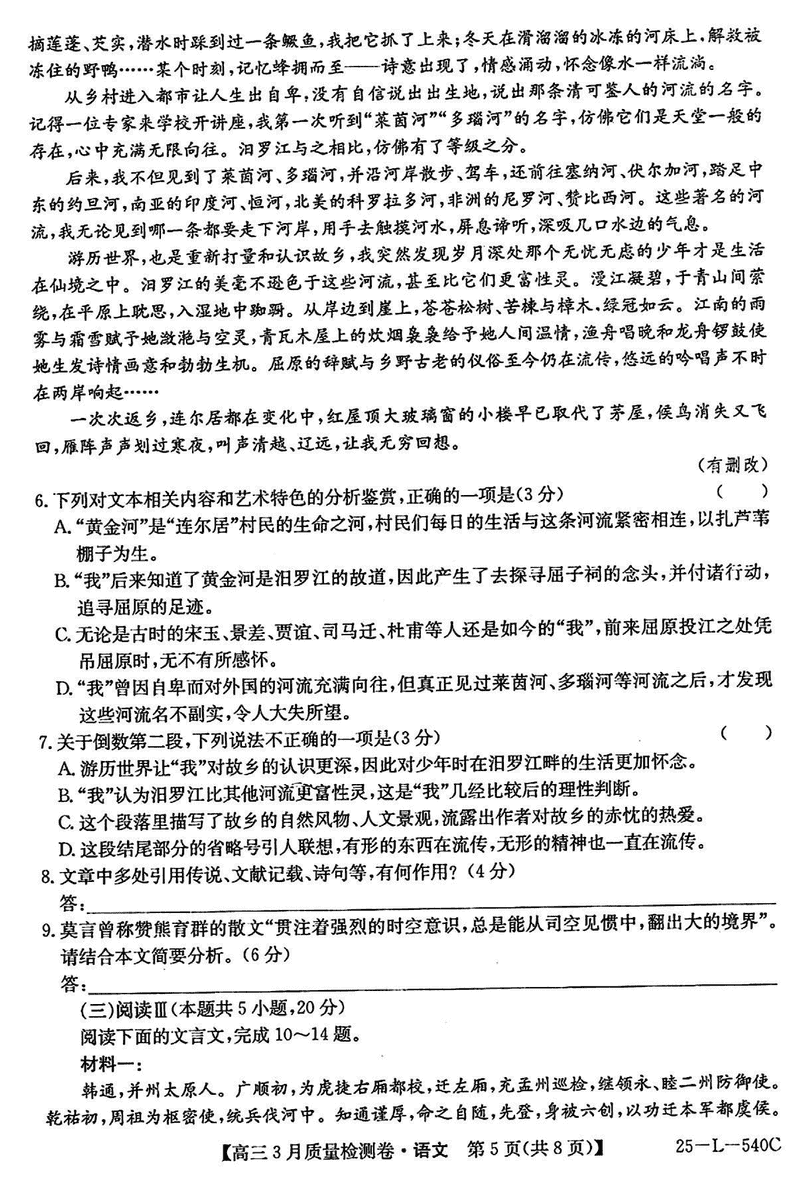 山西省三晋卓越联盟2025届高三3月质检语文试题及答案