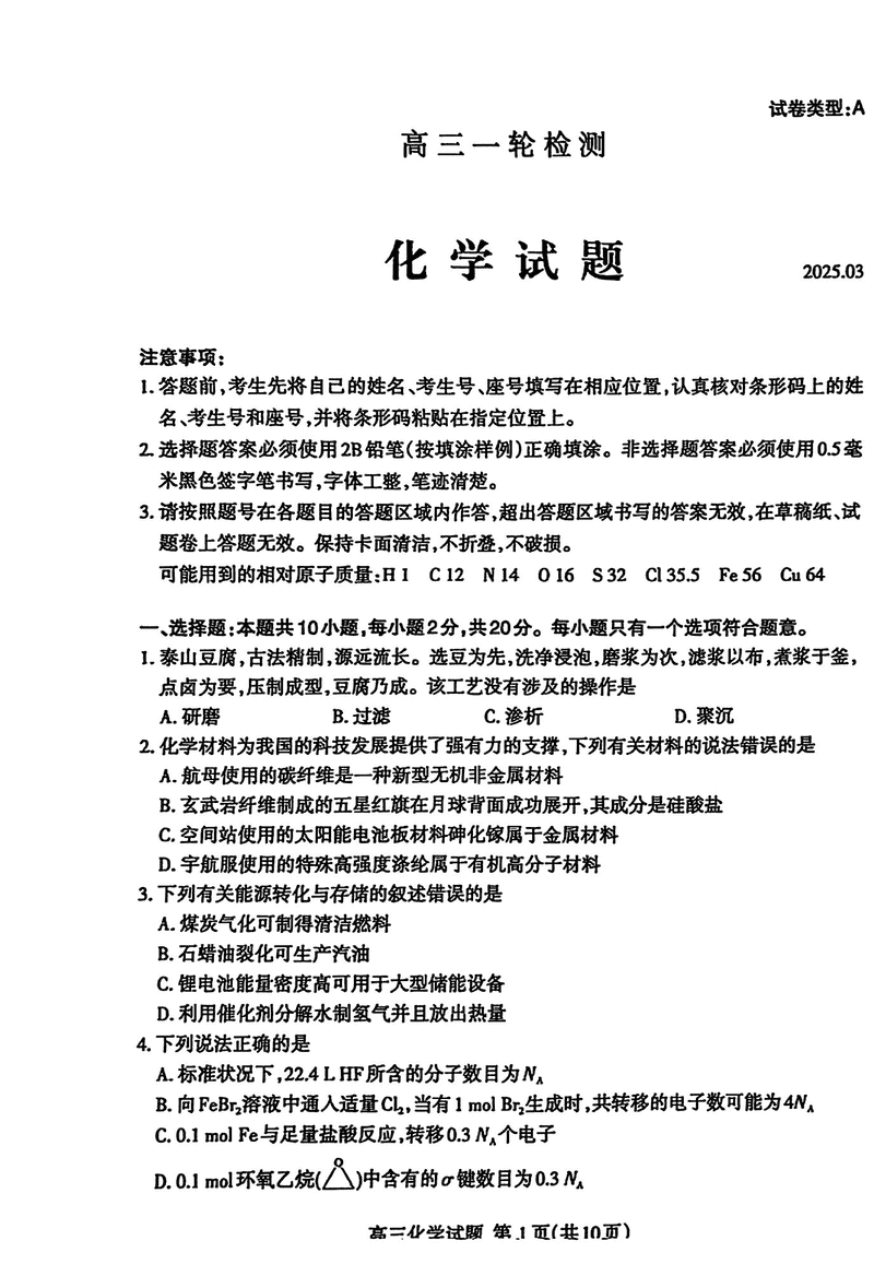 泰安一模2025届高三一轮检测化学试题及答案 时间:2025-03-09 山东 理综试题 泰安一模2025届高三一轮检测化学考试已于近日开考,为方便考生考后及时查看考试情况,查漏补缺、弥补不足,本文整理了试题答案解析相关信息! 汇总:泰安一模2025届高三一轮检测试题及答案汇总 化学试题及答案解析