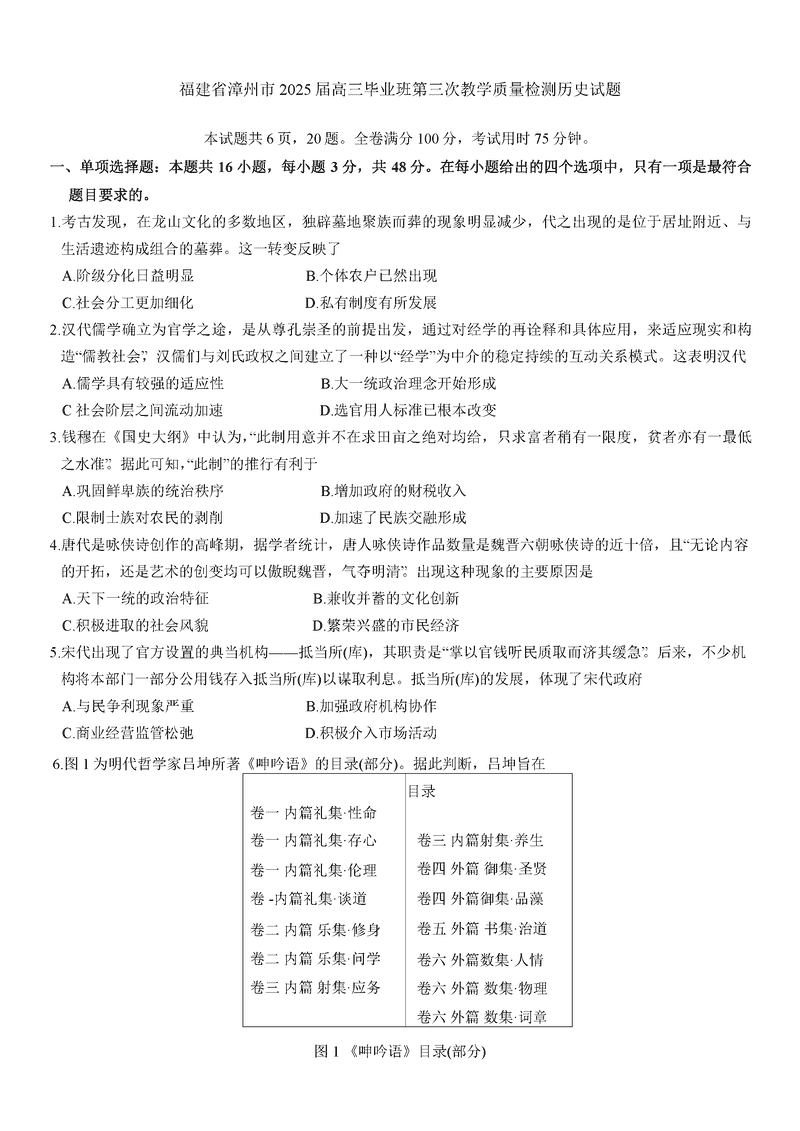 漳州市2025届高三第三次教学质检历史试题及答案 时间:2025-03-10 福建 文综试题 漳州市2025届高三第三次教学质检历史考试已于近日开考,为方便考生考后及时查看考试情况,查漏补缺、弥补不足,本文整理了试题答案解析相关信息! 汇总:漳州市2025届高三第三次教学质量检测试题及答案汇总 历史试题及答案解析