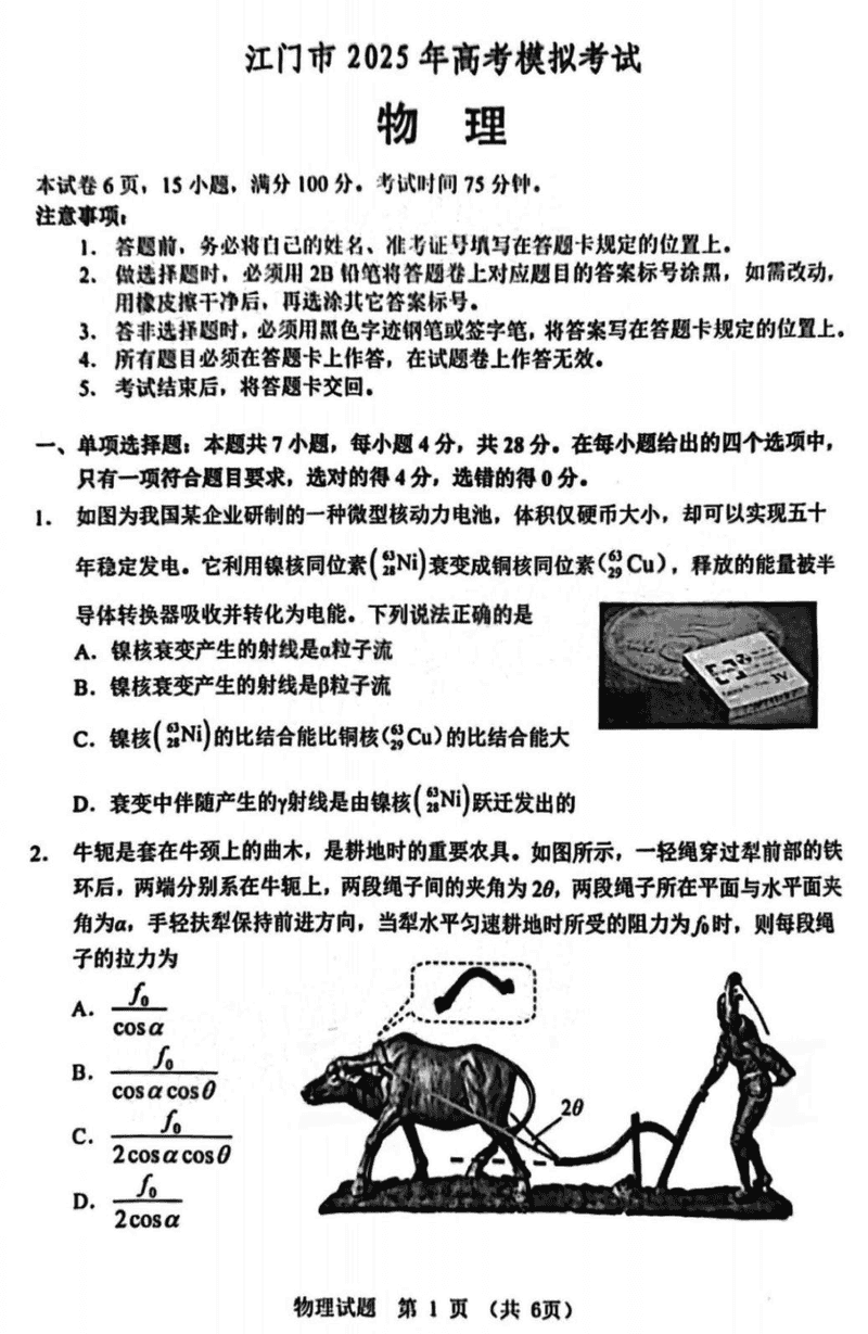 广东江门2025届高三一模物理试题及答案 时间:2025-03-11 广东 理综试题 广东江门2025届高三一模物理考试已于近日开考,为方便考生考后及时查看考试情况,查漏补缺、弥补不足,本文整理了试题答案解析相关信息! 汇总:广东江门2025届高三一模试题及答案汇总 物理试题及答案解析