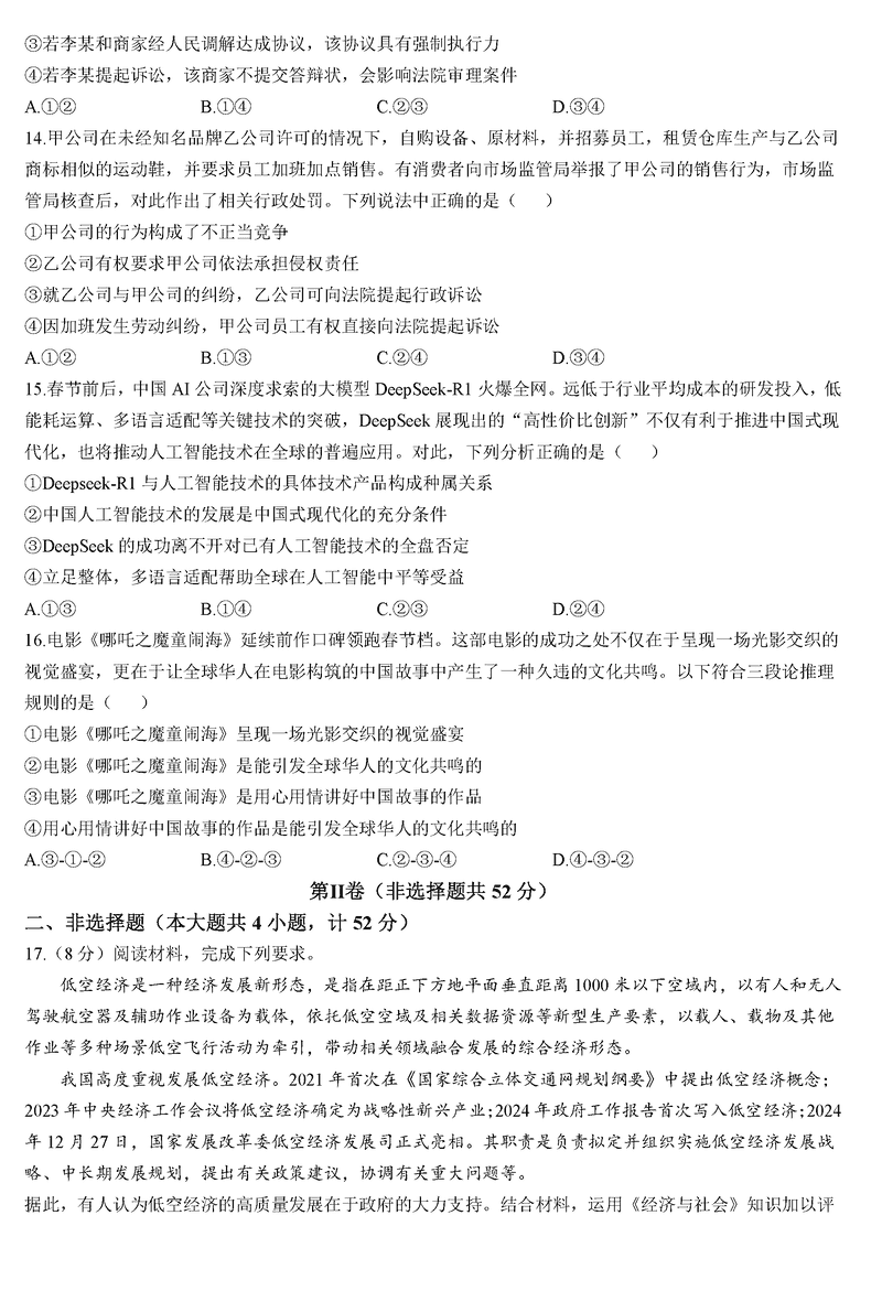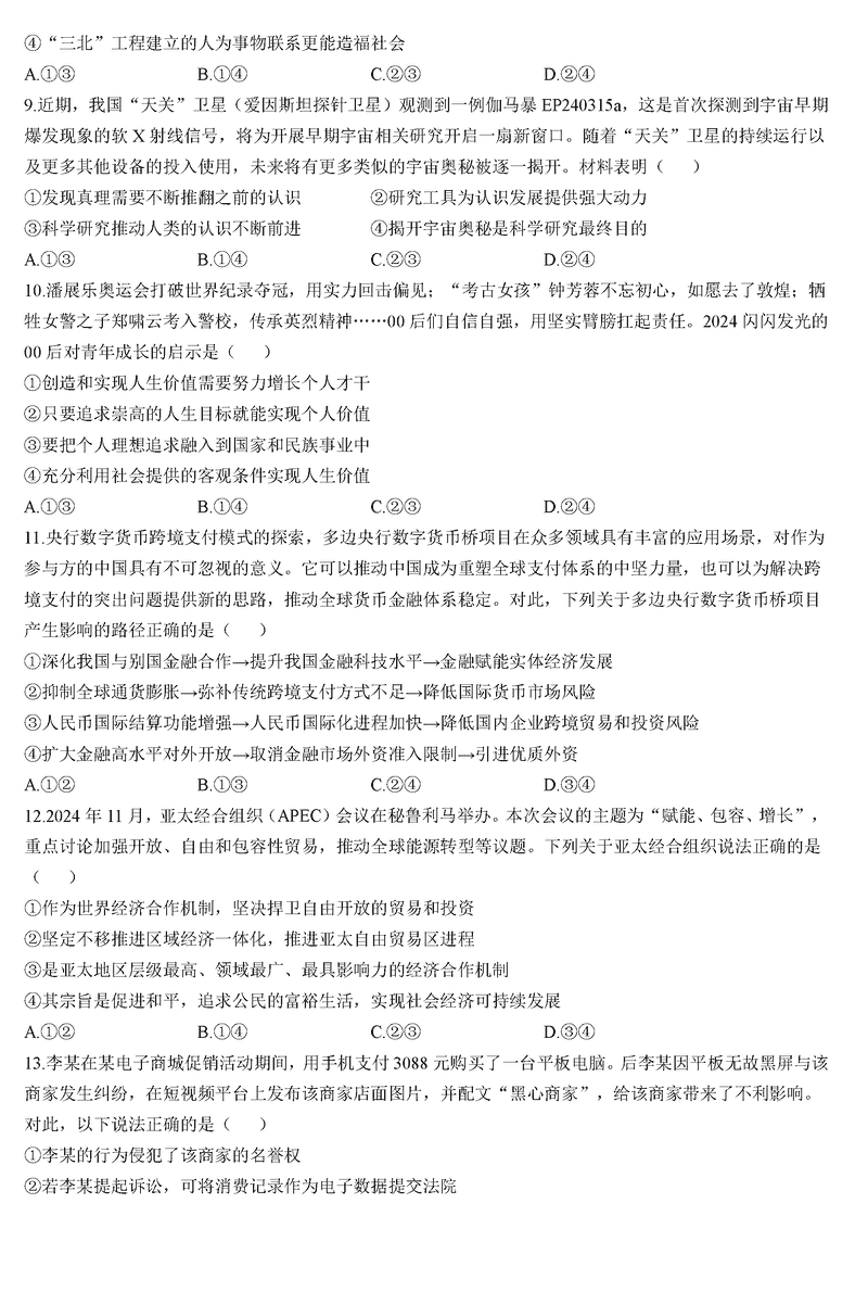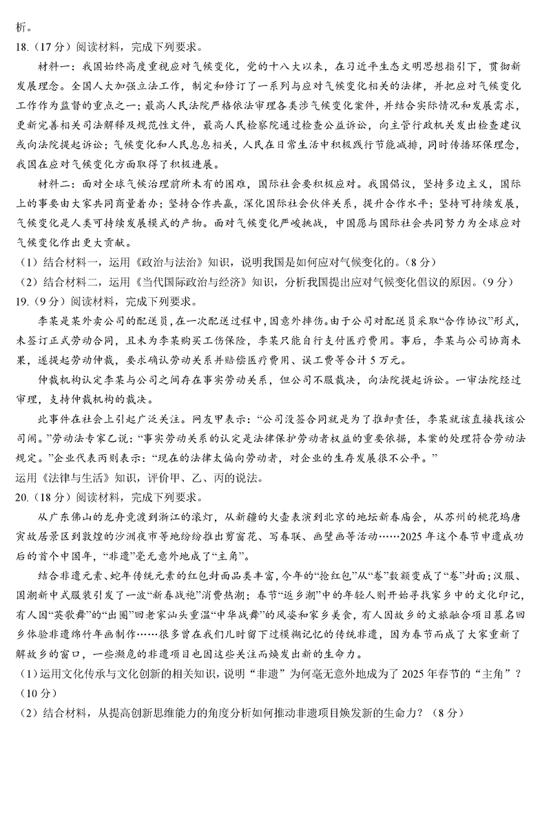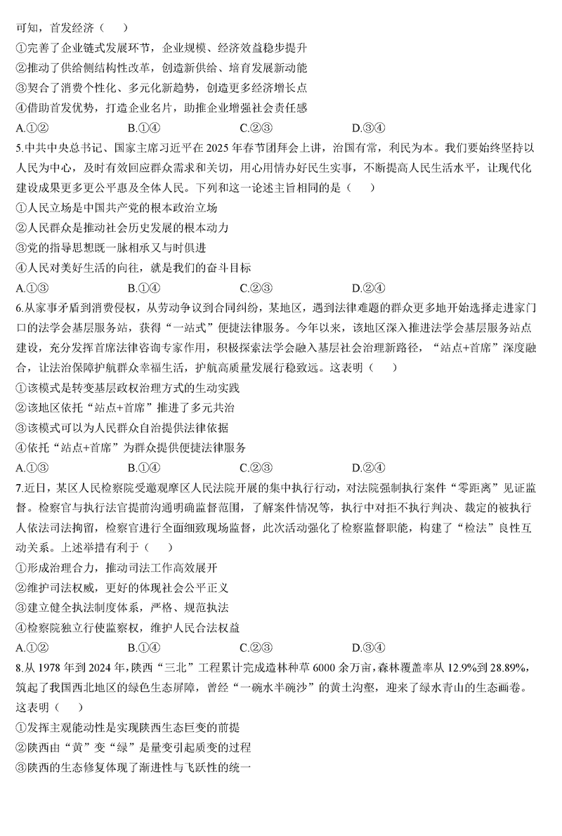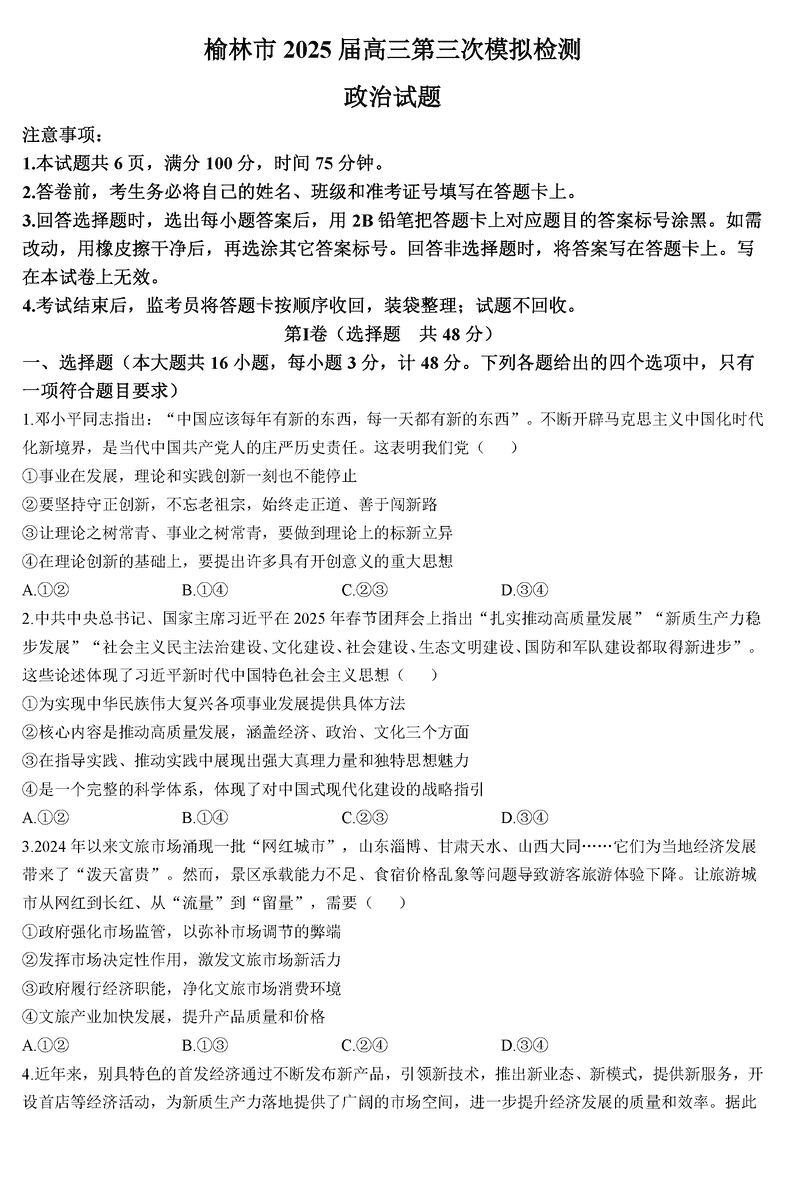 陕西榆林2025届高三第三次模拟检测政治试题及答案