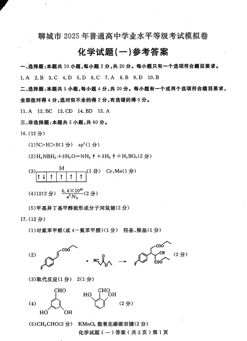 山东聊城一模2025年高三学业水平等级模拟卷化学考试已于近日开考,为方便考生考后及时查看考试情况,查漏补缺、弥补不足,本文整理了试题答案解析相关信息!