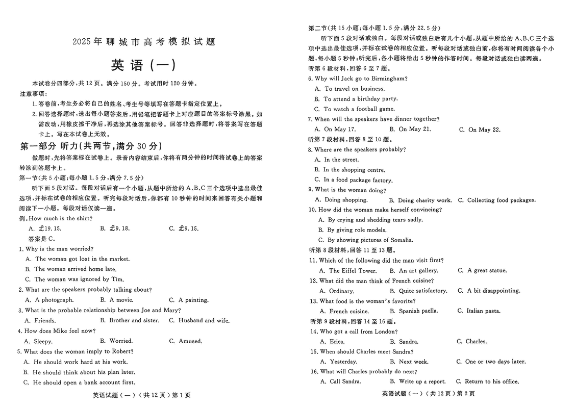 山东聊城一模2025年高三学业水平等级模拟卷英语考试已于近日开考,为方便考生考后及时查看考试情况,查漏补缺、弥补不足,本文整理了试题答案解析相关信息!