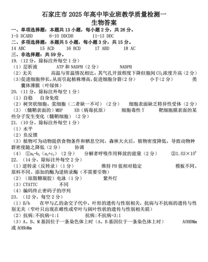 2025届石家庄市高三教学质量检测(一)生物考试已于近日开考,为方便考生考后及时查看考试情况,查漏补缺、弥补不足,本文整理了试题答案解析相关信息!