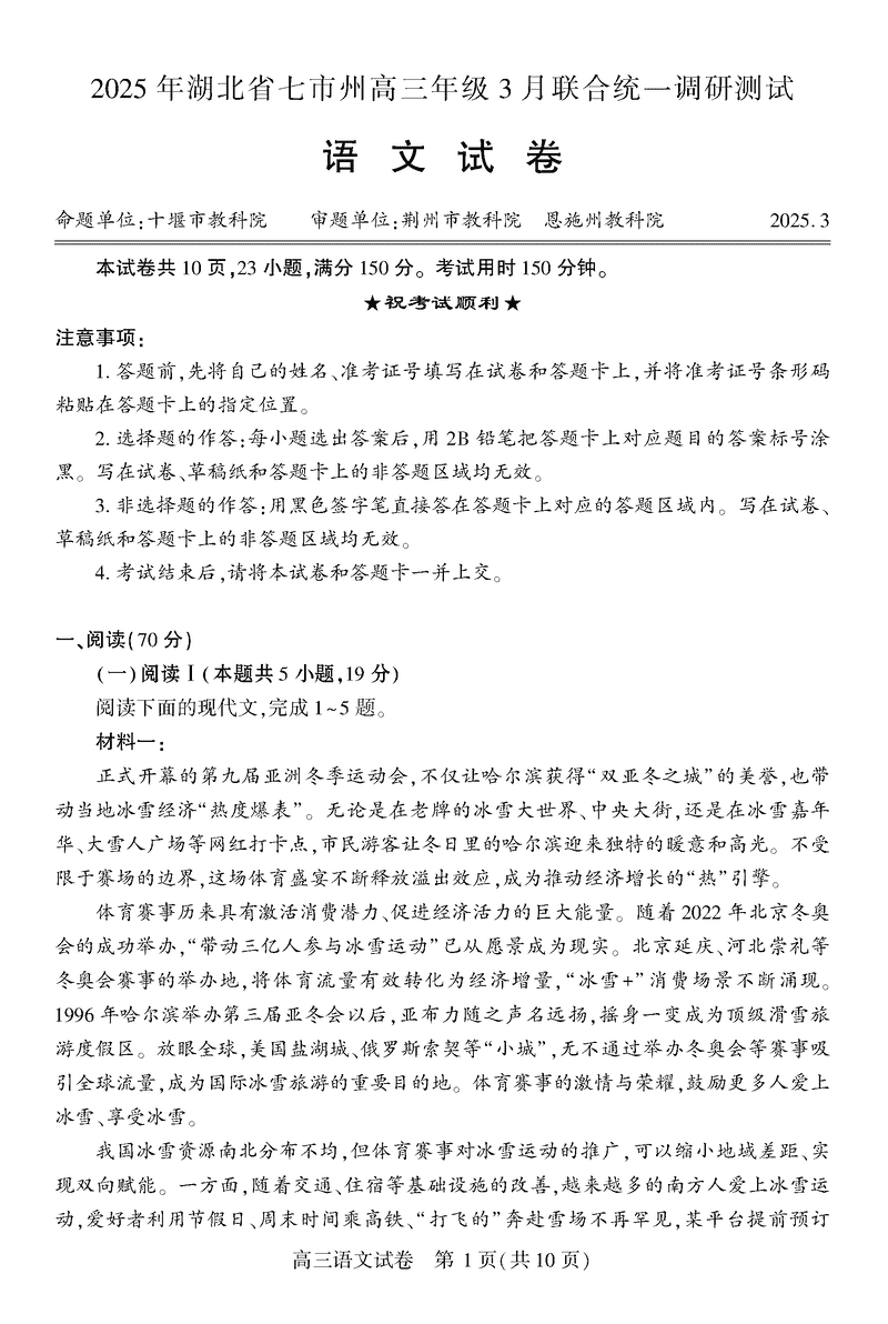 2025年湖北省七市州高三3月联合统一调研测试语文考试已于近日开考,为方便考生考后及时查看考试情况,查漏补缺、弥补不足,本文整理了试题答案解析相关信息!