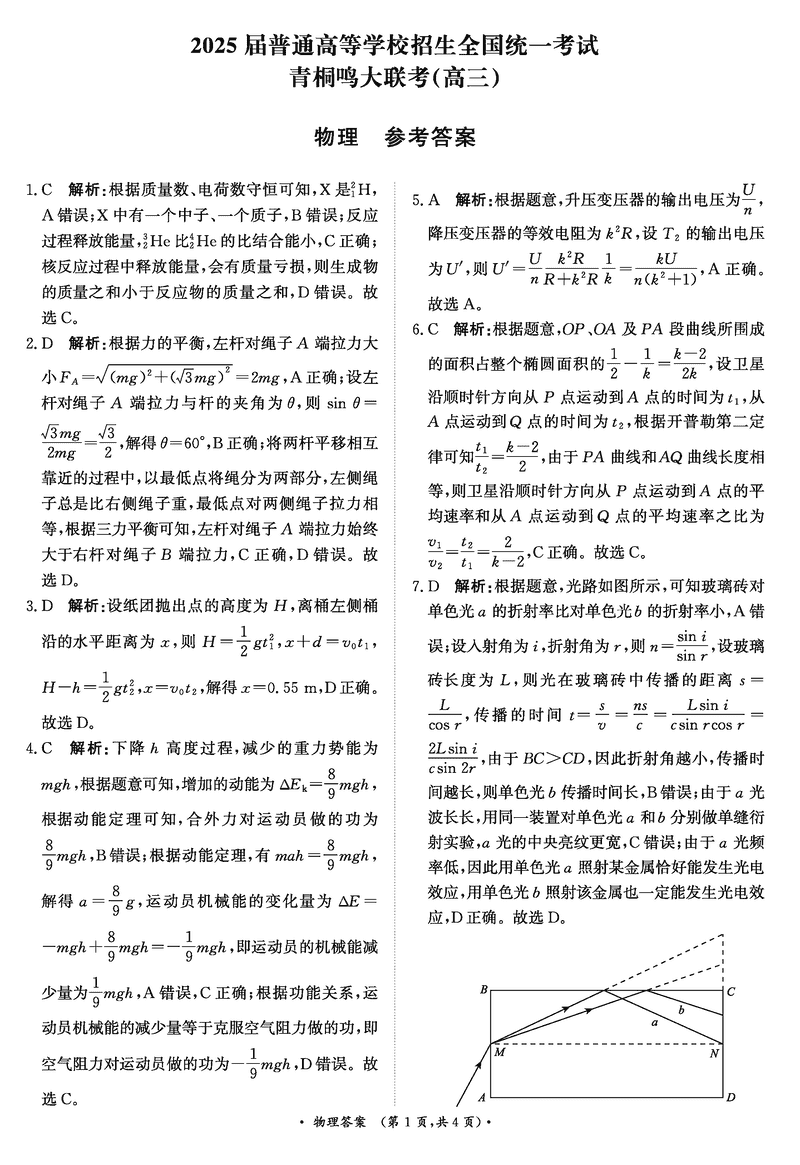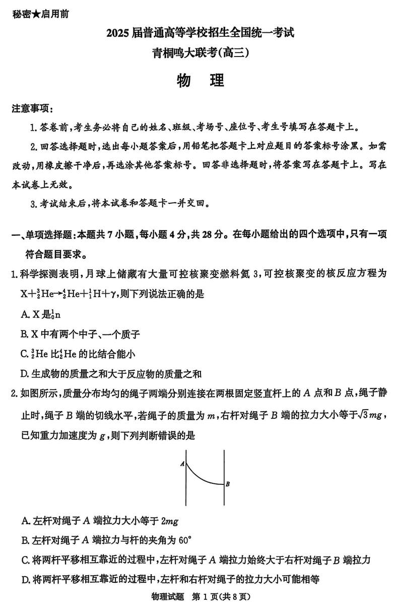 河南青桐鸣大联考2025届高三下学期3月月考物理考试已于近日开考,为方便考生考后及时查看考试情况,查漏补缺、弥补不足,本文整理了试题答案解析相关信息!