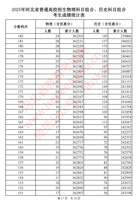 一分一段表是各省教育考试院发布的全省同科类考生分数排名统计表,以1分为单位,统计每个分数对应的考生人数(本段人数)及累计人数(即该分数及以上所有考生总数)。河北2025高考一分一段表如下: