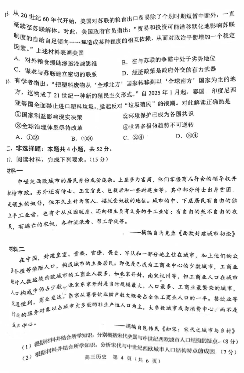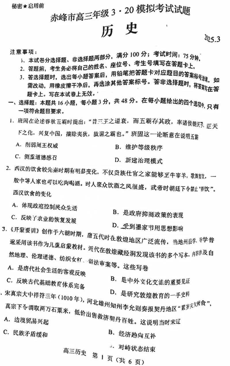 赤峰二模2025届高三下学期3·20模考历史试题及答案