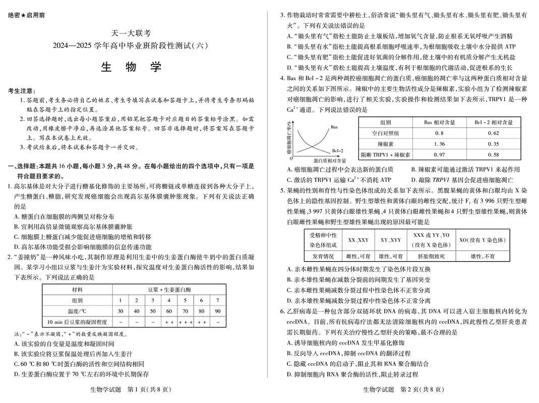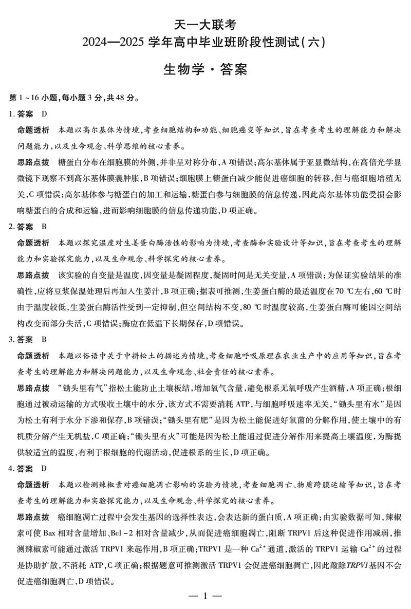 河南省天一大联考2024-2025学年高三阶段性测试(六)生物考试已于近日开考,为方便考生考后及时查看考试情况,查漏补缺、弥补不足,本文整理了试题答案解析相关信息!