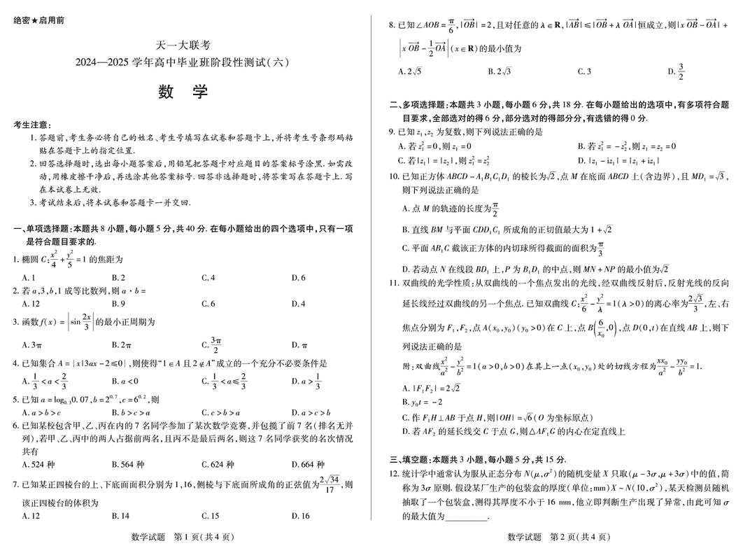河南省天一大联考2024-2025学年高三阶段性测试(六)数学考试已于近日开考,为方便考生考后及时查看考试情况,查漏补缺、弥补不足,本文整理了试题答案解析相关信息!