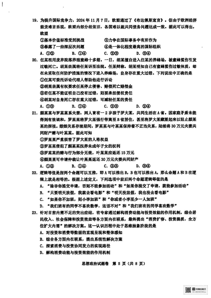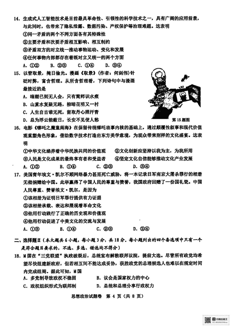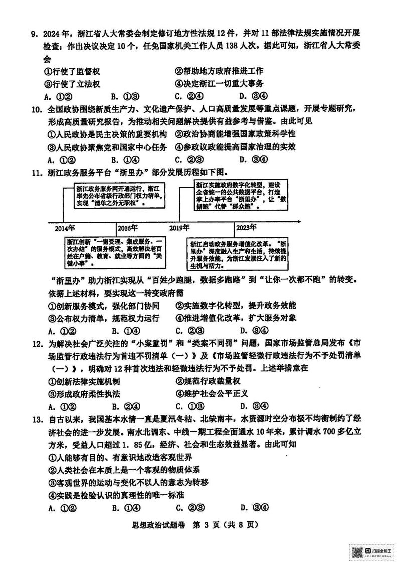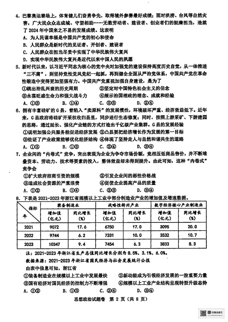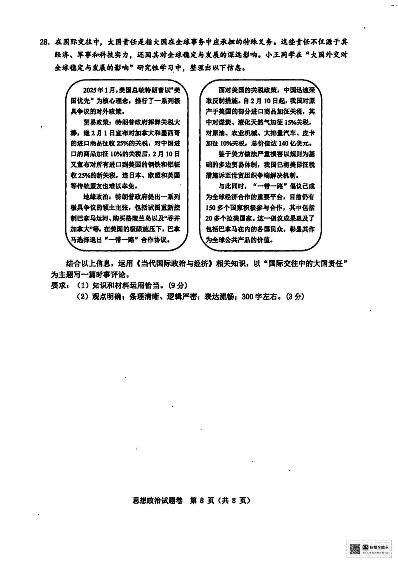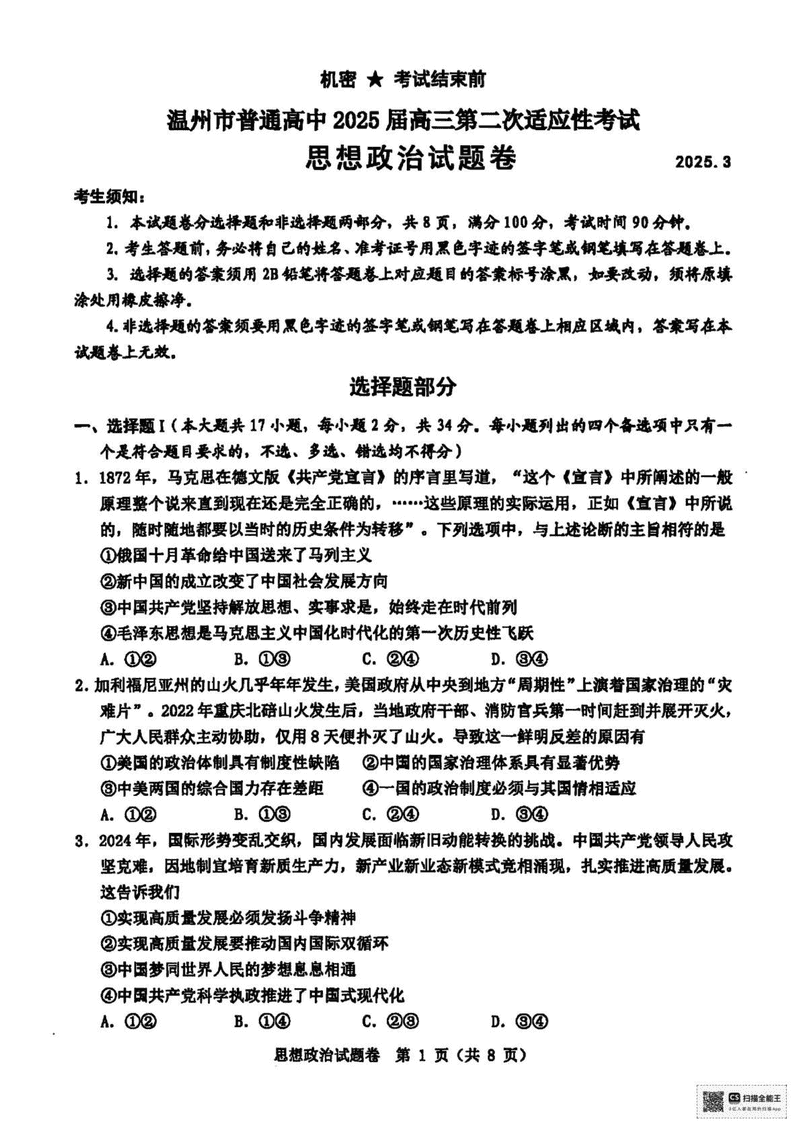 温州市2025届高三下学3月二模政治试题及答案 时间:2025-03-24 浙江 文综试题 温州市2025届高三下学3月二模政治考试已于近日开考,为方便考生考后及时查看考试情况,查漏补缺、弥补不足,本文整理了试题答案解析相关信息! 汇总:温州市2025届高三下学3月二模试题及答案汇总 政治试题及答案解析