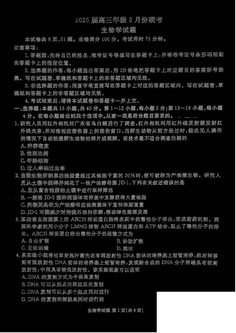 广东省衡水金卷2025届高三3月大联考生物试题及答案 时间:2025-03-24 广东 理综试题 广东省衡水金卷2025届高三3月大联考生物考试已于近日开考,为方便考生考后及时查看考试情况,查漏补缺、弥补不足,本文整理了试题答案解析相关信息! 汇总:广东省衡水金卷2025届高三3月大联考试题及答案汇总 生物试题及答案解析