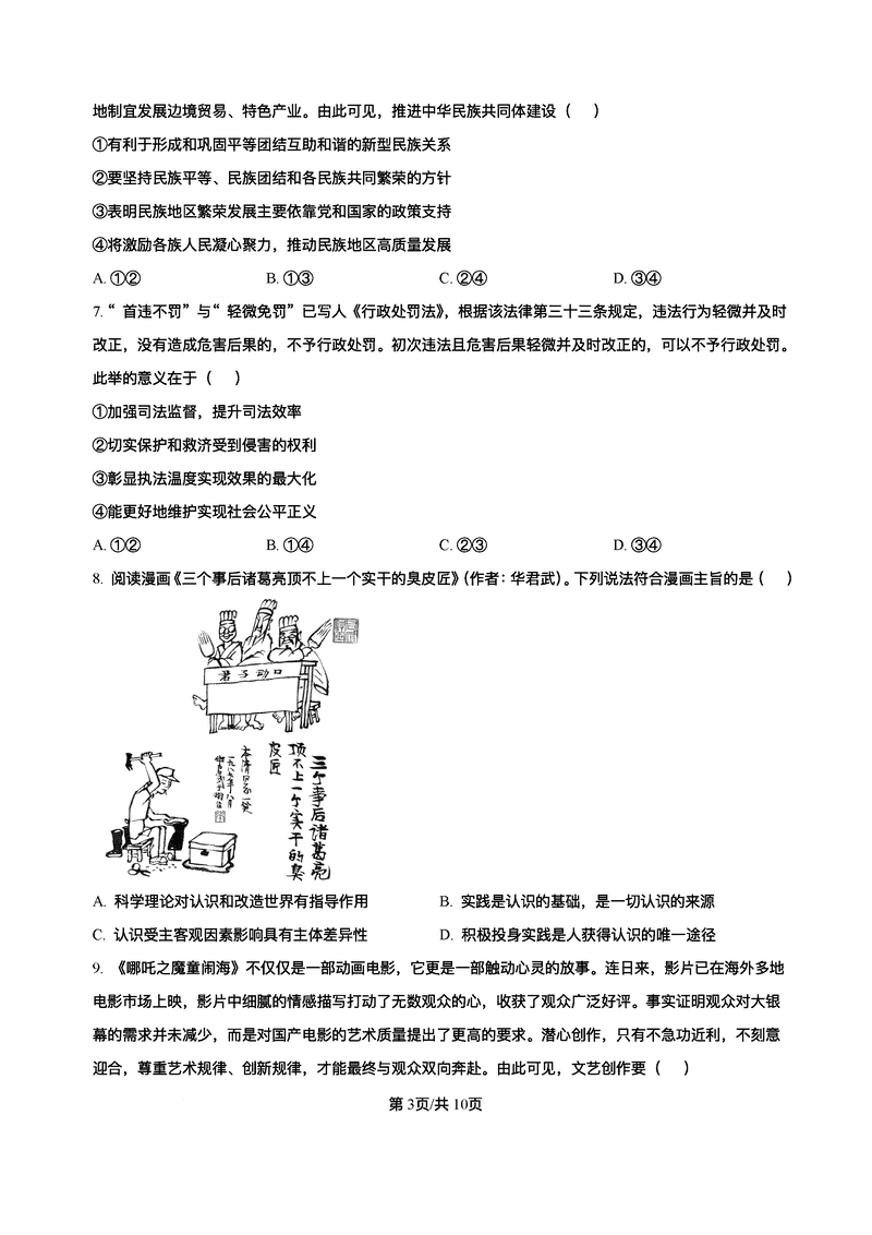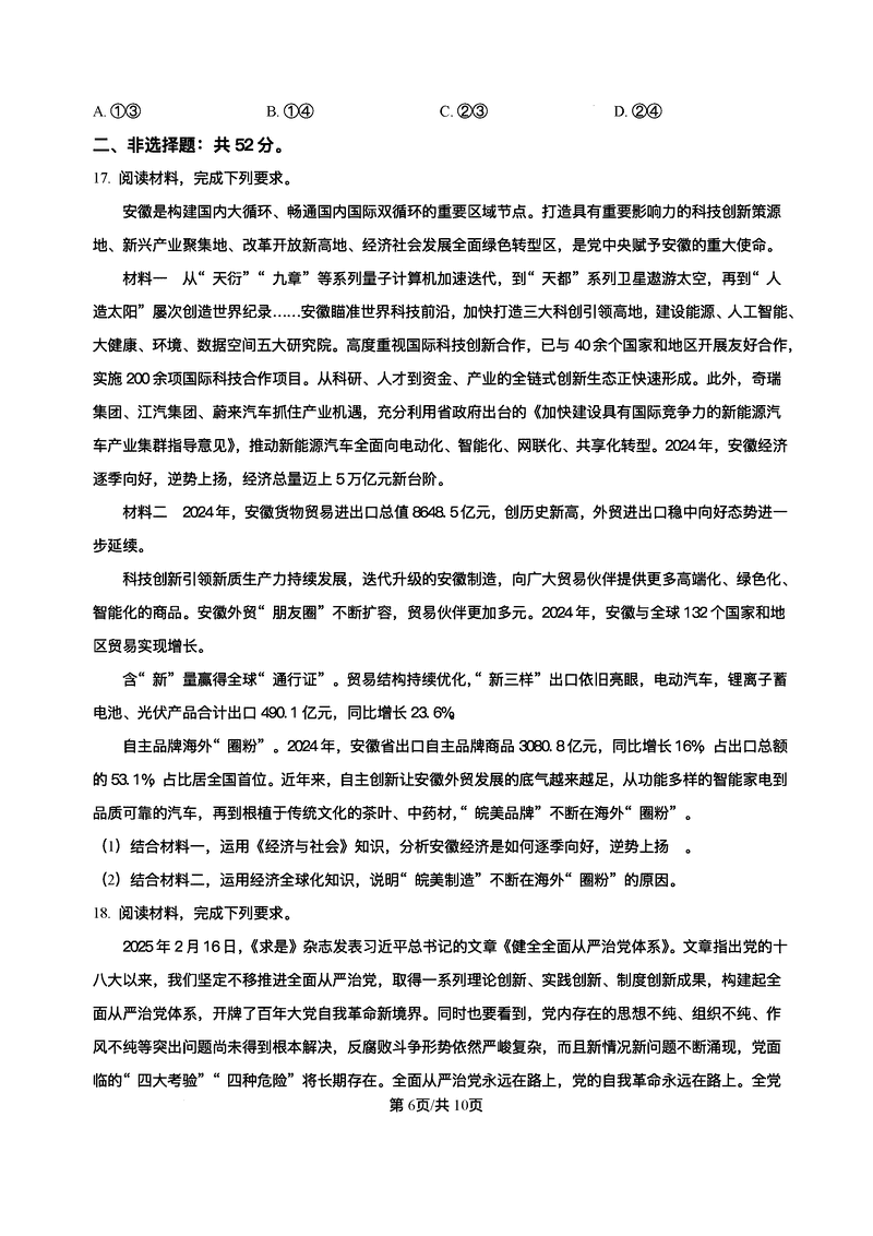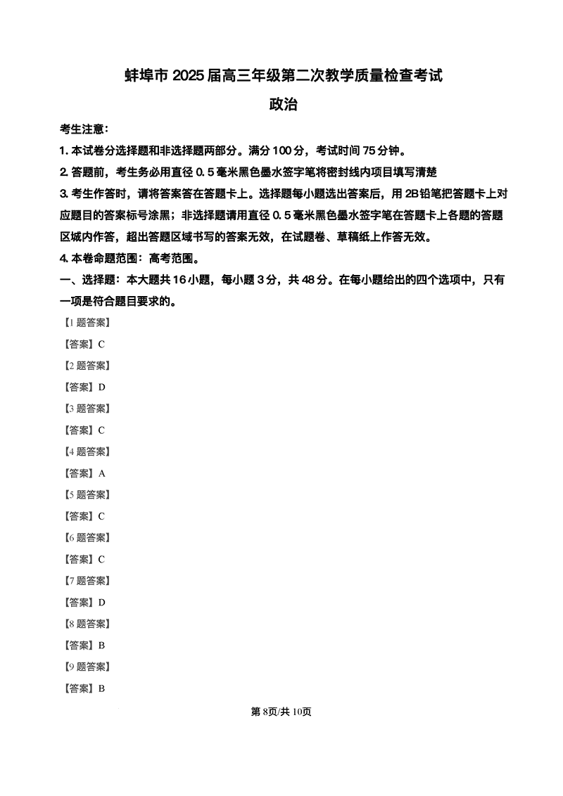 蚌埠市2025届高三第二次教学质检政治试题及答案 时间:2025-03-24 安徽 文综试题 蚌埠市2025届高三第二次教学质检政治考试已于近日开考,为方便考生考后及时查看考试情况,查漏补缺、弥补不足,本文整理了试题答案解析相关信息! 汇总:蚌埠市2025届高三第二次教学质量检查试题及答案汇总 政治试题及答案解析