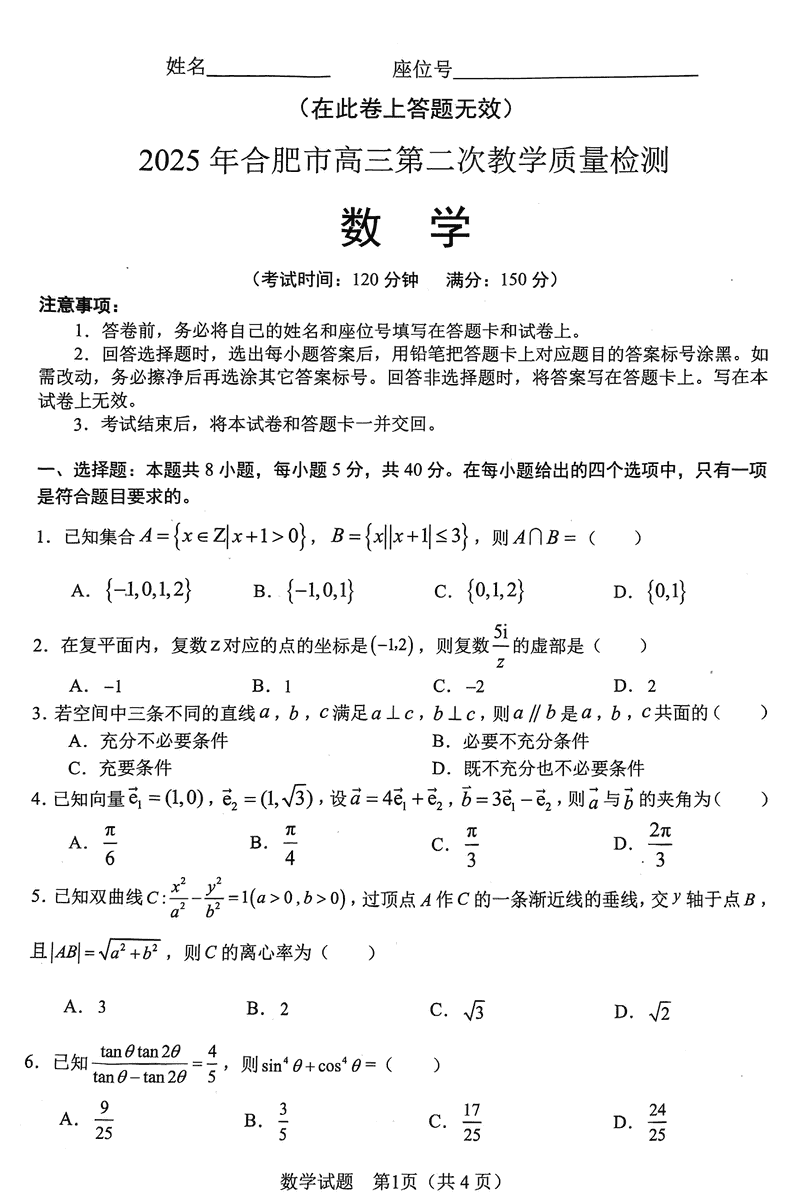 合肥二模2025届高三第二次教学质检数学试题及答案汇总
