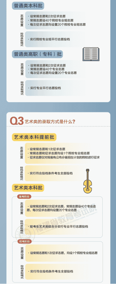 艺术类本科批:从2021年起,我省艺术类本科批分为省考阶段和校考阶段依次进行录取。其中,(1)省考阶段为使用我省艺术类专业省级统考成绩录取并执行我省统一投档原则的院校专业;设常规志愿和2次征求志愿,常规志愿设置40个平行且有顺序排列的专业志愿,每次征求志愿均设置20个平行且有顺序排列的专业志愿;常规志愿和征求志愿均按考生艺术类综合分实行专业平行志愿投档的录取模式。(2)校考阶段为使用校考成绩录取的院校,设常规志愿和1次征求志愿,常规志愿和征求志愿均设置1个院校专业组志愿,实行符合投档条件考生全部投档的录取模式。
