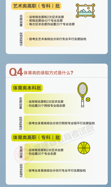 体育类本科批:从2021年起,我省艺术类本科批分为省考阶段和校考阶段依次进行录取。其中,(1)省考阶段为使用我省艺术类专业省级统考成绩录取并执行我省统一投档原则的院校专业;设常规志愿和2次征求志愿,常规志愿设置40个平行且有顺序排列的专业志愿,每次征求志愿均设置20个平行且有顺序排列的专业志愿;常规志愿和征求志愿均按考生艺术类综合分实行专业平行志愿投档的录取模式。(2)校考阶段为使用校考成绩录取的院校,设常规志愿和1次征求志愿,常规志愿和征求志愿均设置1个院校专业组志愿,实行符合投档条件考生全部投档的录取模式。