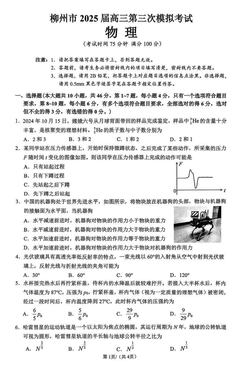 柳州三模2025届高三第三次模考物理试题及答案 时间:2025-03-31 广西 理综试题 柳州三模2025届高三第三次模考物理考试已于近日开考,为方便考生考后及时查看考试情况,查漏补缺、弥补不足,本文整理了试题答案解析相关信息! 汇总:柳州三模2025届高三第三次模拟考试试题及答案汇总 物理试题及答案解析