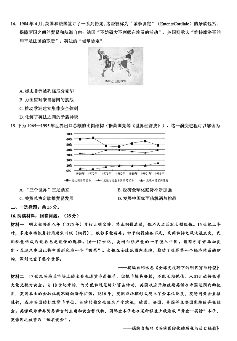 重庆康德卷2025年高考模拟调研(四)历史试题及答案 时间:2025-04-03 重庆 文综试题 重庆康德卷2025年高考模拟调研(四)历史考试已于近日开考,为方便考生考后及时查看考试情况,查漏补缺、弥补不足,本文整理了试题答案解析相关信息! 汇总:重庆康德卷2025年高考模拟调研(四)试题及答案汇总 历史试题及答案解析