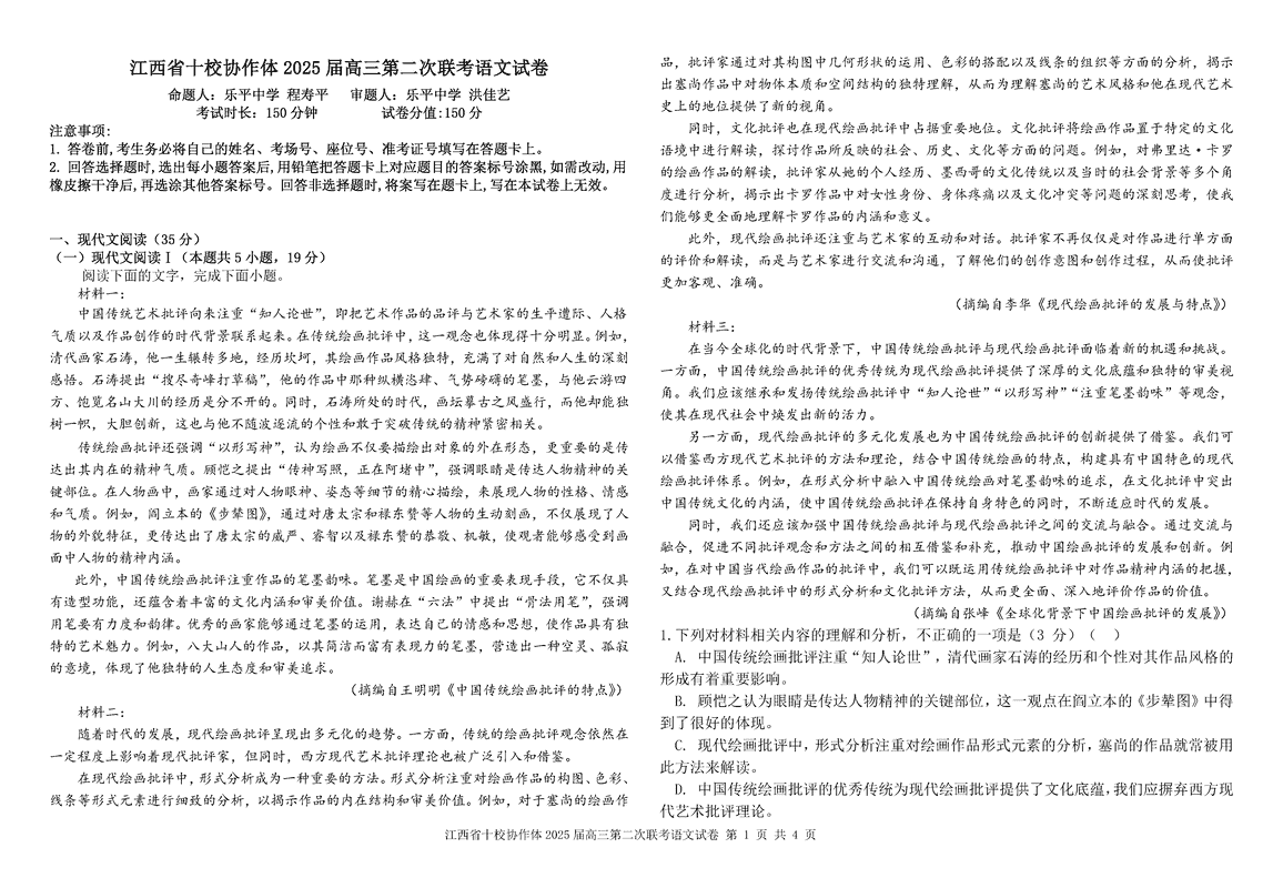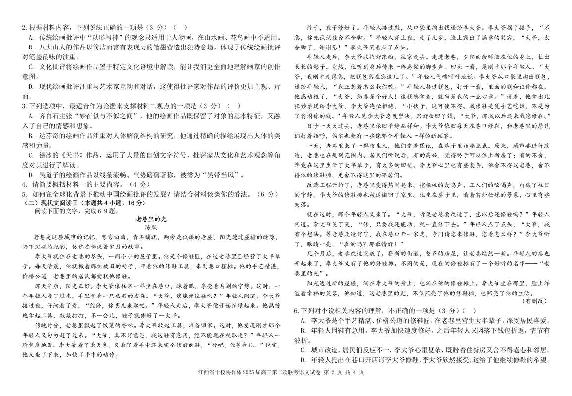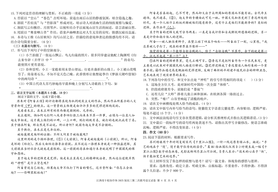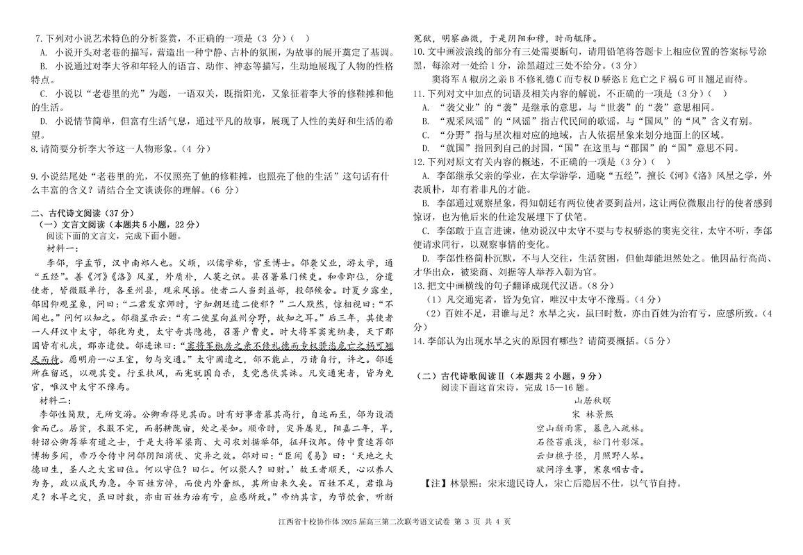 江西省十校协作体2025届高三第二次联考语文试题及答案