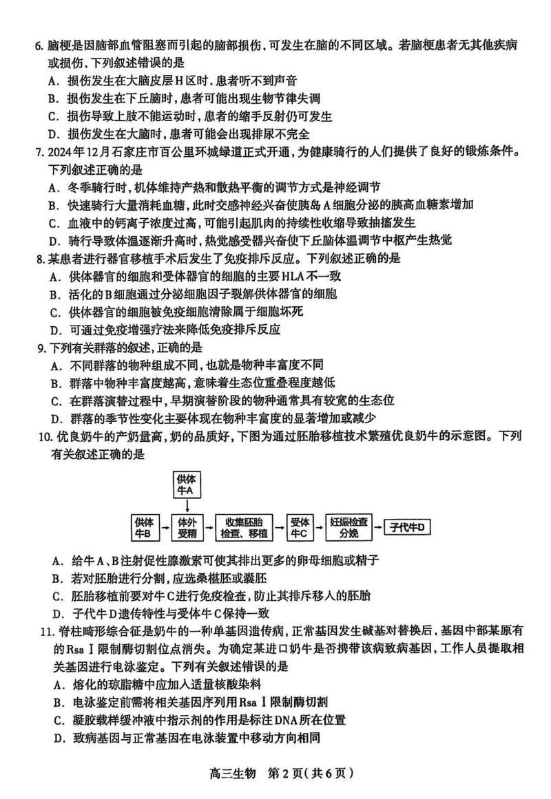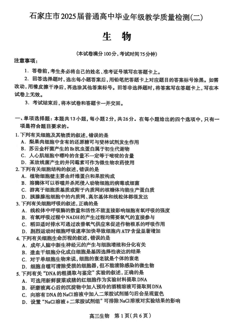 2025届石家庄市高三质检(二)生物考试已于近日开考,为方便考生考后及时查看考试情况,查漏补缺、弥补不足,本文整理了试题答案解析相关信息!