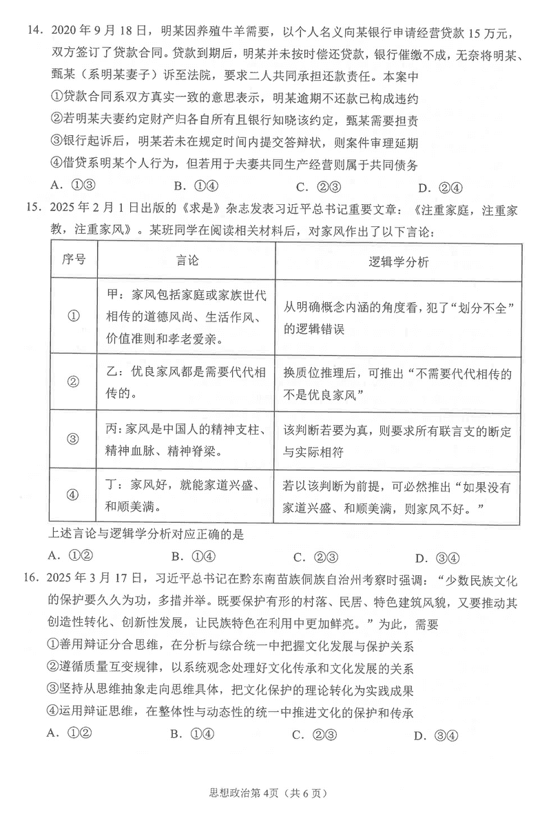 南充三诊高2025届高考适应性政治试题及答案 时间:2025-04-10 四川 文综试题 南充三诊高2025届高考适应性政治考试已于近日开考,为方便考生考后及时查看考试情况,查漏补缺、弥补不足,本文整理了试题答案解析相关信息! 汇总:南充三诊高2025届高考适应性考试试题及答案汇总 政治试题及答案解析