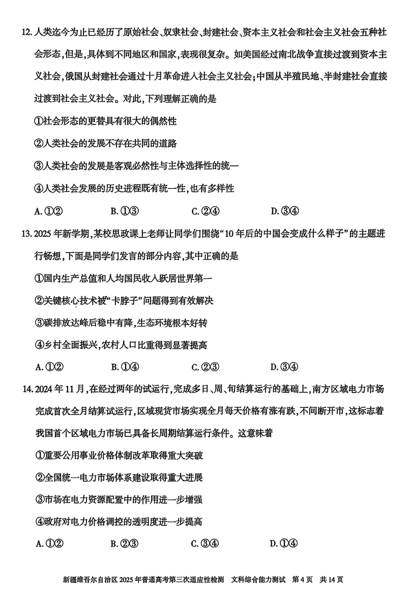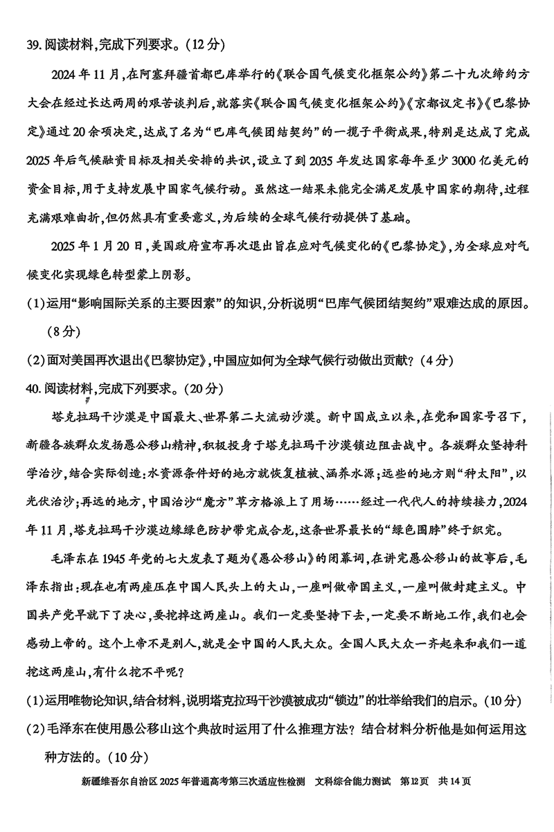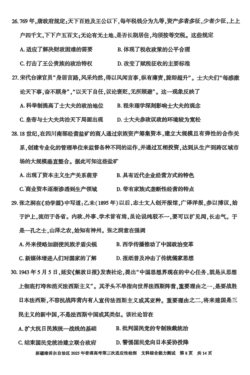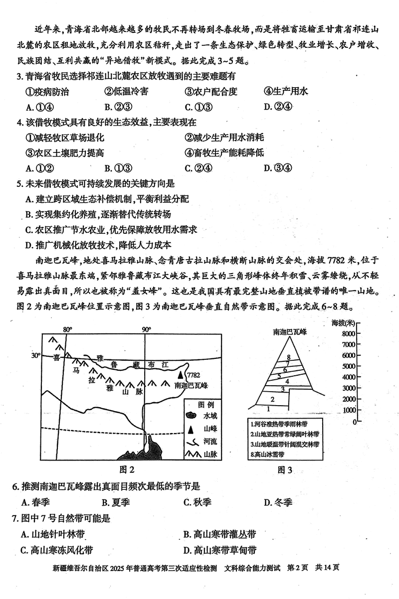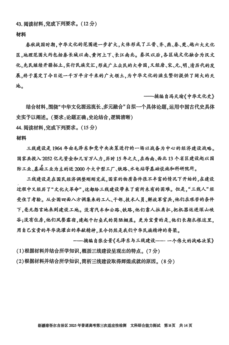 新疆2025届高三下学期第三次适应性检测文综试题及答案